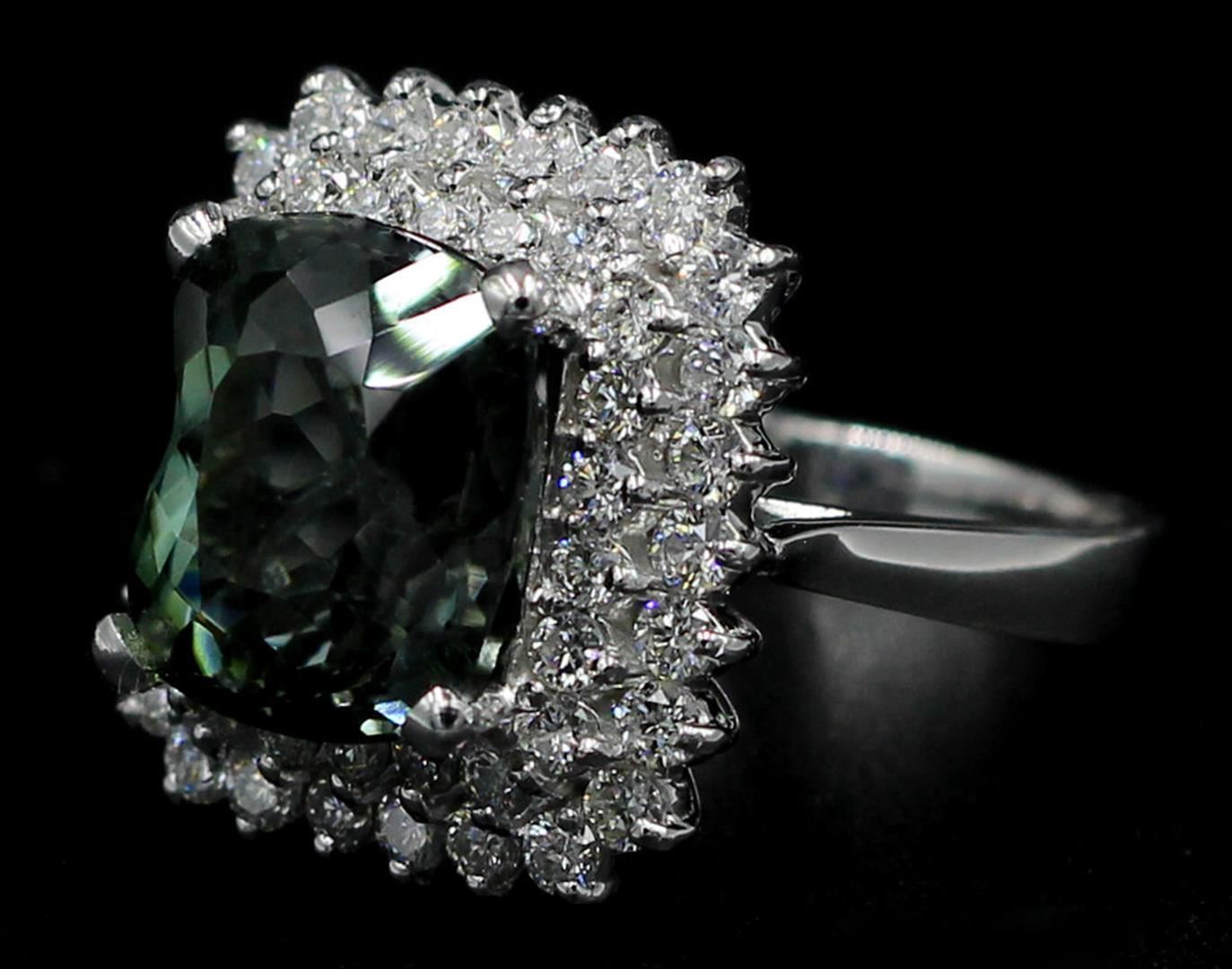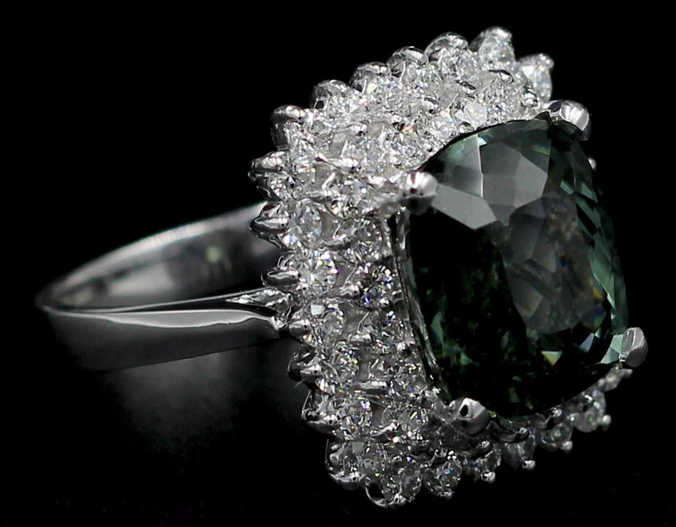 One Oval Cut Natural Green Tourmaline Diamond Band Ring in 14k White Gold. Size is 6.75 but resizable. Ring total carat weight is 8.39 Ct. Setting style if 4 prong with accent diamonds. Total gold weight 8.29 grams. Total stone amount is 49 diamonds and condition is brand new. Main stone is natural and non enhanced. Main stone is 6.95 carats, cushion brilliant shape, fine clarity, fine medium green/blue color, and with excellent cut. Side stones are natural and non-enhanced. Carat weight is 1.44 carats, round brilliant cut, diamond clarity SI, G color, with excellent cut. Total amount of side diamonds: 48.