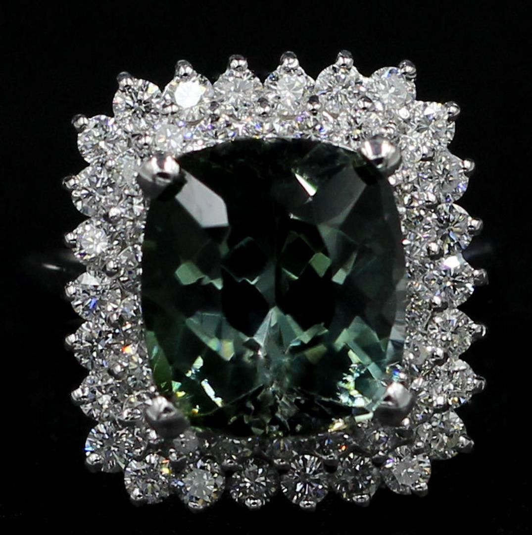 One Oval Cut Natural Green Tourmaline Diamond Band Ring in 14k White Gold. Size is 6.75 but resizable. Ring total carat weight is 8.39 Ct. Setting style if 4 prong with accent diamonds. Total gold weight 8.29 grams. Total stone amount is 49 diamonds and condition is brand new. Main stone is natural and non enhanced. Main stone is 6.95 carats, cushion brilliant shape, fine clarity, fine medium green/blue color, and with excellent cut. Side stones are natural and non-enhanced. Carat weight is 1.44 carats, round brilliant cut, diamond clarity SI, G color, with excellent cut. Total amount of side diamonds: 48.