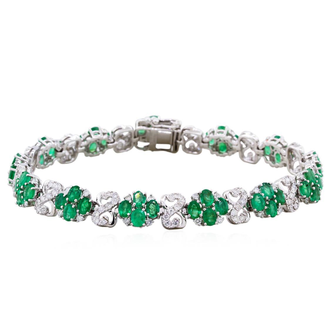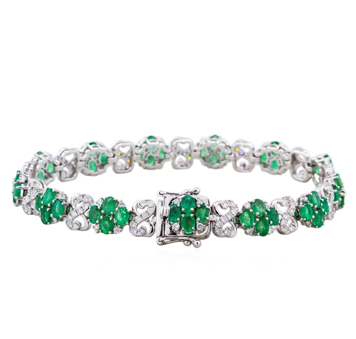 One emerald and diamond bracelet featuring 2.09 carats of round diamonds and 52 prong set oval shaped emeralds weighing in at 8.43 carats total are set in 19.25 grams of 14KT white gold. Open box closure with double safety lock clasps.