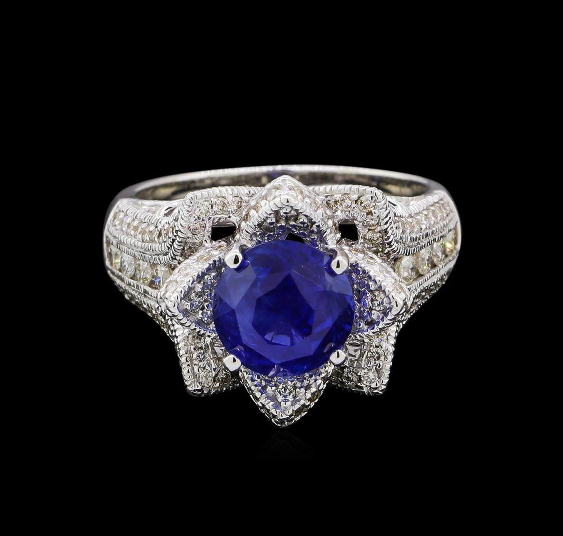 One electronically tested 14KT white gold lady's cast fashion ring with a scalloped basket halo with a bright polish finish. The featured lady's ring has a shank measuring 2.0 millimeters in width. Identified with markings of "14K". Condition is new, good workmanship. Containing: One prong set oval modified brilliant cut natural blue zircon, measuring 11.55 x 8.48 x 7.71mm, (depth est.) 15%. bulge factor, approximate weight of 8.44ct., clarity is eye clean, medium dark, moderately strong, very strongly greenish blue color, (GIA vstgB 6/4), cut is very good. Transmitting light with no distortion, transparent. Colored gemstones are presumed to have been subjected to commonly used enhancement processes. Graded in the setting.One Hundred Forty-Six prong set round brilliant cut diamonds, measuring 1.55 - 1.50 x 0.95mm (depth est.) approximate total weight of 146 Stones = 1.95ct. Graded in the setting. Clarity: VS-2 to SI-2. Color: H - ICut Good. Total Weight of Colored Stones 8.44ct. Total Weight of Diamonds 1.95ct. Total Weight of Ring 9.20gm. GAS Appraised.