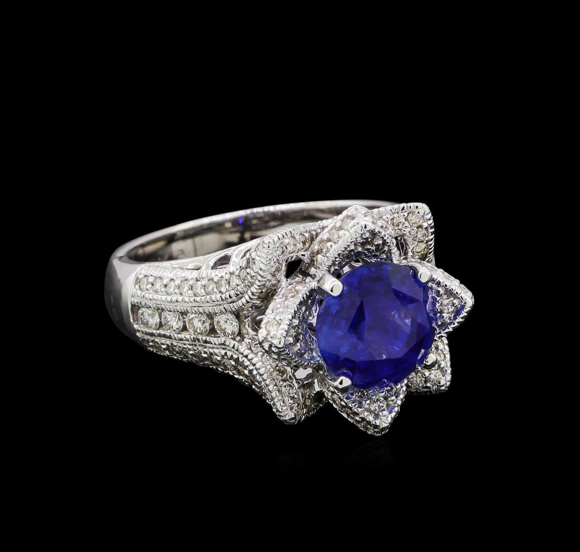 One electronically tested 14KT white gold lady's cast fashion ring with a scalloped basket halo with a bright polish finish. The featured lady's ring has a shank measuring 2.0 millimeters in width. Identified with markings of "14K". Condition is new, good workmanship. Containing: One prong set oval modified brilliant cut natural blue zircon, measuring 11.55 x 8.48 x 7.71mm, (depth est.) 15%. bulge factor, approximate weight of 8.44ct., clarity is eye clean, medium dark, moderately strong, very strongly greenish blue color, (GIA vstgB 6/4), cut is very good. Transmitting light with no distortion, transparent. Colored gemstones are presumed to have been subjected to commonly used enhancement processes. Graded in the setting.One Hundred Forty-Six prong set round brilliant cut diamonds, measuring 1.55 - 1.50 x 0.95mm (depth est.) approximate total weight of 146 Stones = 1.95ct. Graded in the setting. Clarity: VS-2 to SI-2. Color: H - ICut Good. Total Weight of Colored Stones 8.44ct. Total Weight of Diamonds 1.95ct. Total Weight of Ring 9.20gm. GAS Appraised.