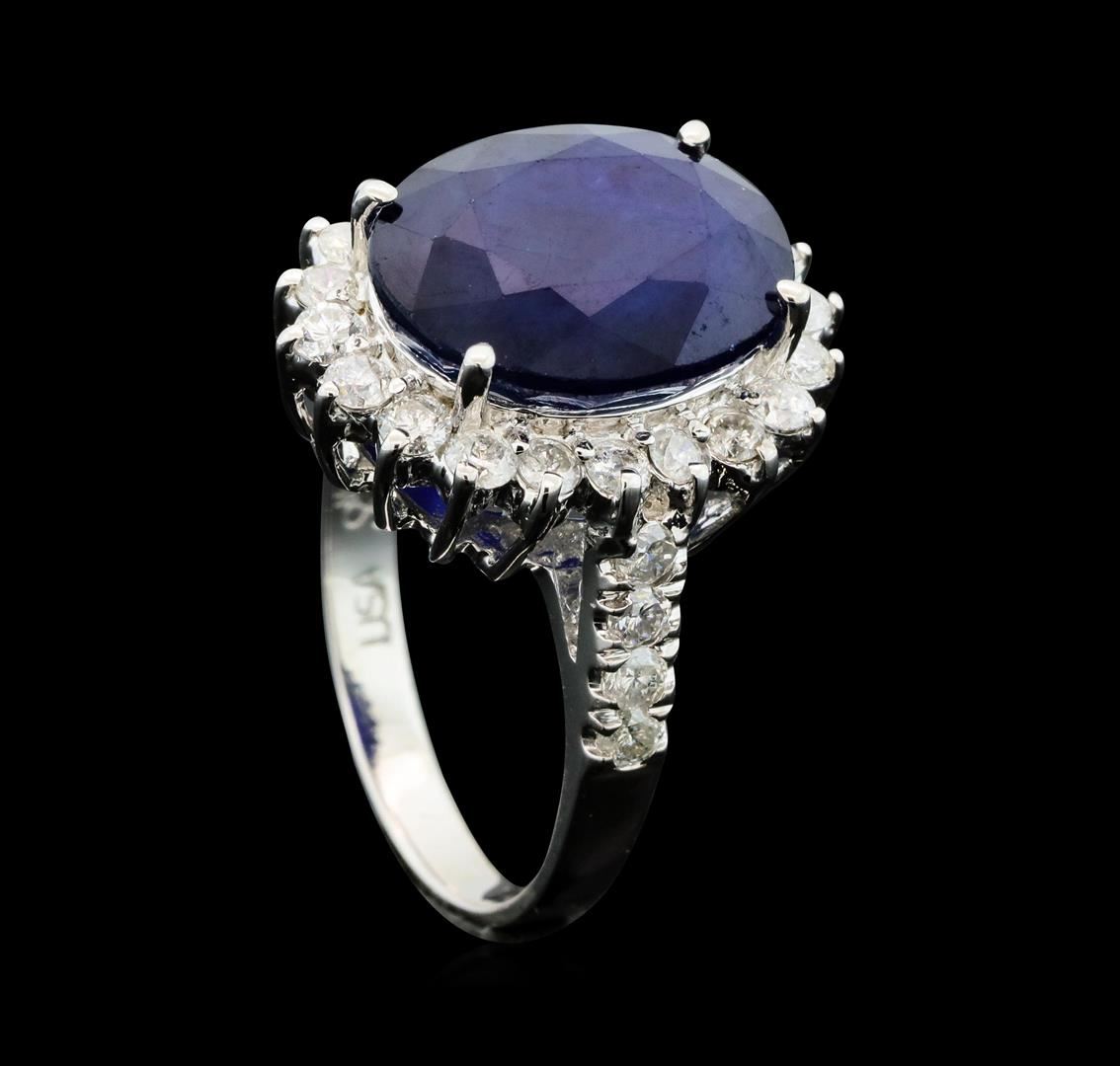 One electronically tested 14KT white gold ladies cast sapphire and diamond ring with a bright polish finish. The featured sapphire is set within a diamond bezel supported by diamond set shoulders, completed by a two and one-half millimeter wide band. Identified with markings of "K14". Condition is new, good workmanship. Containing: One prong set oval mixed cut natural blue sapphire approximate weight of 8.57ct., clarity is heavily included, type II, dark, very slightly grayish, blue color, (GIA B 7/3), cut is good. Transmitting light somewhat diffusely, transparent to translucent. Naturally occurring internal & external characteristics are present. Indications of laboratory high temperature diffusion treatment. Graded in the setting.Twenty-Eight prong set round brilliant cut diamonds approximate total weight of 28 Stones = 1.04ct. Graded in the setting. Clarity: I-1 to I-2. Color: F - H. Total Weight of Colored Stones 8.57ct. Total Weight of Diamonds 1.04ct. Total Weight of Ring 6.67gm. AIG Appraised.