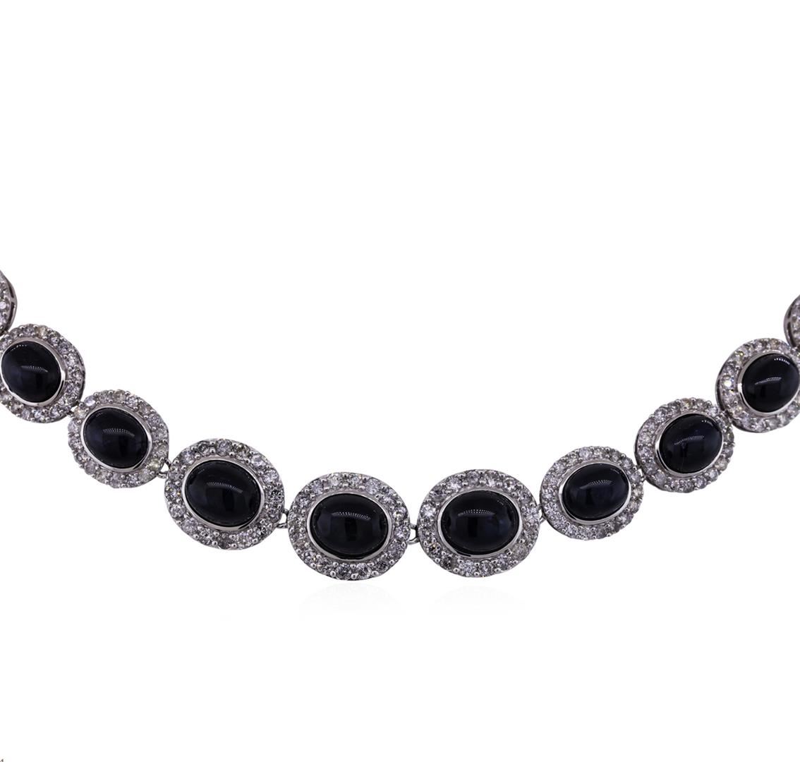 One electronically tested 14KT white gold ladies cast & assembled star sapphire and diamond necklace. Seventeen and one-quarter inch length necklace features a graduating flexible star sapphire and diamond bezel ribbon, terminating in a concealed clasp with twin safeties. Bright polish finish. Trademark is Orianne. Identified with markings of "14K". Condition is new, good workmanship. Containing: Thirty-four prong set oval cabochon cut natural blue star sapphires approximate. Total Weight of 86.83ct., dark, very slightly grayish, violetish blue color, (GIA vB 7/3), cut is good. Each stone has a complete six ray star with strong intensity and good movement. Transmitting light very diffusely, opaque. Naturally occurring internal & external characteristicsare present. Color grade is an average for the group. Indications of laboratory high temperaturediffusion treatment. Graded in the setting.Three Hundred Forty prong set round brilliant and single cut cut diamonds approximate. Total Weight of 340 Stones = 7.99ct. Graded in the setting. Clarity: I-1 to I-2. Color: G - I. Total Weight of Colored Stones 86.83ct. Total Weight of Diamonds 7.99ct. Total Weight of Necklace 58.72gm. AIG Appraised at $46,600.00.