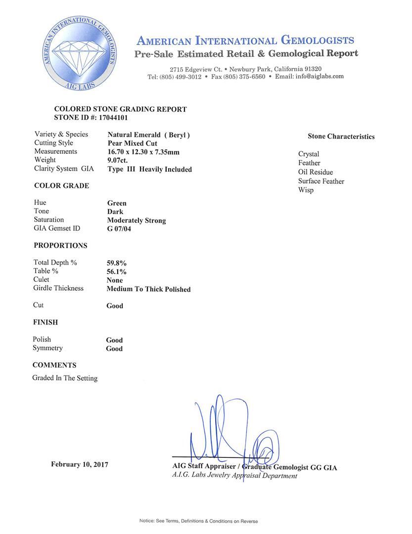 One electronically tested 14KT white gold ladies cast & assembled emerald and diamond pendant with chain. The pendant features an emerald set within an elaborate diamond set lattice, completed by a white gold bail. The pendant is supported by an eighteen inch length 14KT white gold designer style chain, terminating in a lobster claw clasp. Bright polish finish. Trademark is Orianne. Identified with markings of "14K". Condition is new, good workmanship. Containing: One prong set pear mixed cut natural emerald, measuring 16.70 x 12.30 x 7.35mm, 10%. bulge factor, approximate weight of 9.07ct., clarity is heavily included, type III, dark, moderately strong, green color, (GIA G 7/4), cut is good. Transmitting light somewhat diffusely, transparent to translucent. Naturally occurring internal & external characteristics are present. Indications of oil residue. Colored Stone Grading Report attached. Graded in the setting. One Hundred Forty-Two prong set round brilliant cut diamonds approximate total weight of 142 Stones = 1.56ct. Graded in the setting. Clarity: I-2 to I-3. Color: G - I. Total Weight of Colored Stones 9.07ct. Total Weight of Diamonds 1.56ct. Total Weight of Pendant With Chain 17.53gm. AIG Appraised.