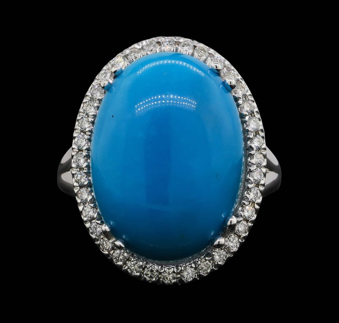 One electronically tested 14KT white gold lady's cast fashion ring with a split shank halo with a bright polish finish. The featured lady's ring has a shank measuring 2.13 millimeters wide. Identified with markings of "14K". Condition is new, good workmanship. Containing: One prong set oval cabochon cut natural turquoise, measuring 18.00 x 13.14 x 5.30mm, (depth est.) approximate weight of 9.70ct., medium, strong, green blue color, (GIA GB 5/5), cut is very good. Colored gemstones are presumed to have been subjected to commonly used enhancement processes. Graded in the setting. Thirty-Six prong set round brilliant cut diamonds, measuring 1.40 - 1.30 x 0.81mm (depth est.) approximate total weight of 36 Stones = 0.32ct. Graded in the setting. Clarity: SI-1 to SI-2. Color: H - ICut Good. Total Weight of Colored Stones 9.70ct. Total Weight of Diamonds 0.32ct. Total Weight of Ring 7.20gm. GAS Appraised.