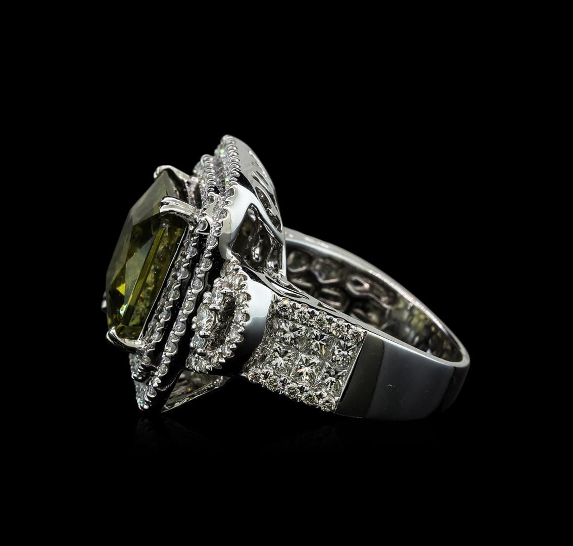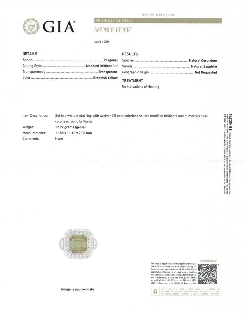 One electronically tested 14KT white gold lady's cast fashion ring with a double cushion halo with a bright polish finish. The featured lady's ring has a shank measuring 3.55 millimeters wide. Identified with markings of "14K". Condition is new, good workmanship. Containing: One prong set emerald modified brilliant cut natural yellow sapphire-unenhanced, measuring 11.88 x 11.48 x 7.08mm, (depth est.) approximate weight of 9.71ct., clarity is slightly included, medium, very slightly brownish, greenish yellow color, (GIA gY 5/3), cut is very good. Transmitting light with a minimum of distortion, transparent. No indications of heat treatment. Graded in the setting in the GIA Laboratory, Report #2173500739.Twelve invisible set princess cut diamonds, measuring 2.30 x 2.20 x 1.65mm (depth est.) approximate total weight of 12 Stones = 0.82ct. Graded in the setting. Clarity: VS-1 to VS-2. Color: H - ICut Very Good Two prong set round brilliant cut diamonds, measuring 2.20 - 2.15 x 1.35mm (depth est.) approximate total weight of 2 Stones = 0.08ct. Graded in the setting. Clarity: SI-1. Color: ICut Good One Hundred Eight prong set round brilliant cut diamonds, measuring 1.40 - 1.20 x 0.81mm (depth est.) approximate total weight of 108 Stones = 0.94ct. Graded in the setting. Clarity: VS-2 to SI-1. Color: G - HCut Good. Total Weight of Colored Stones 9.71ct. Total Weight of Diamonds 1.84ct. Total Weight of Ring 13.10gm. GAS Appraised.