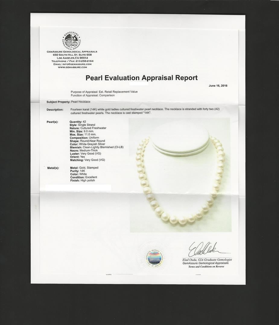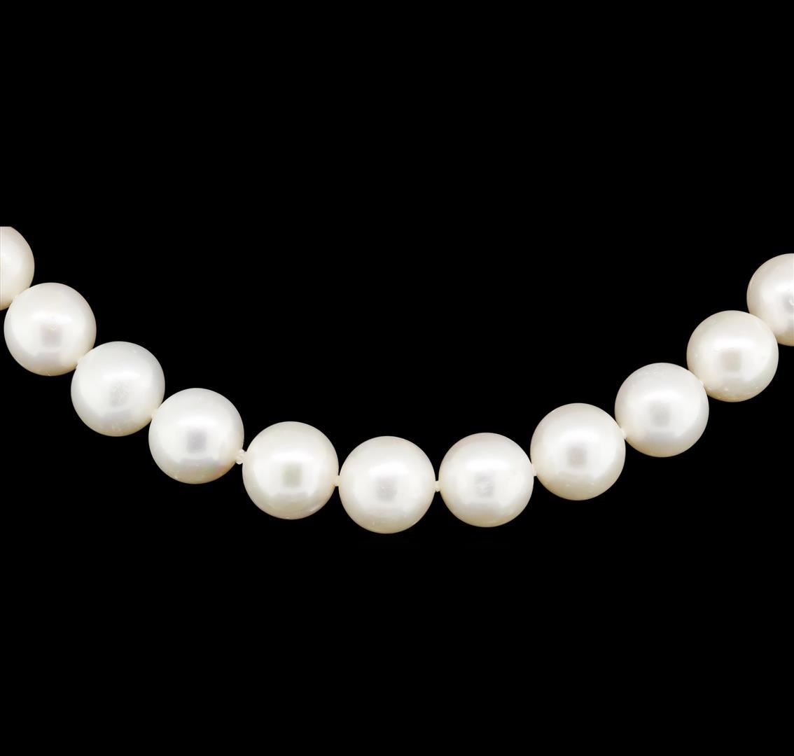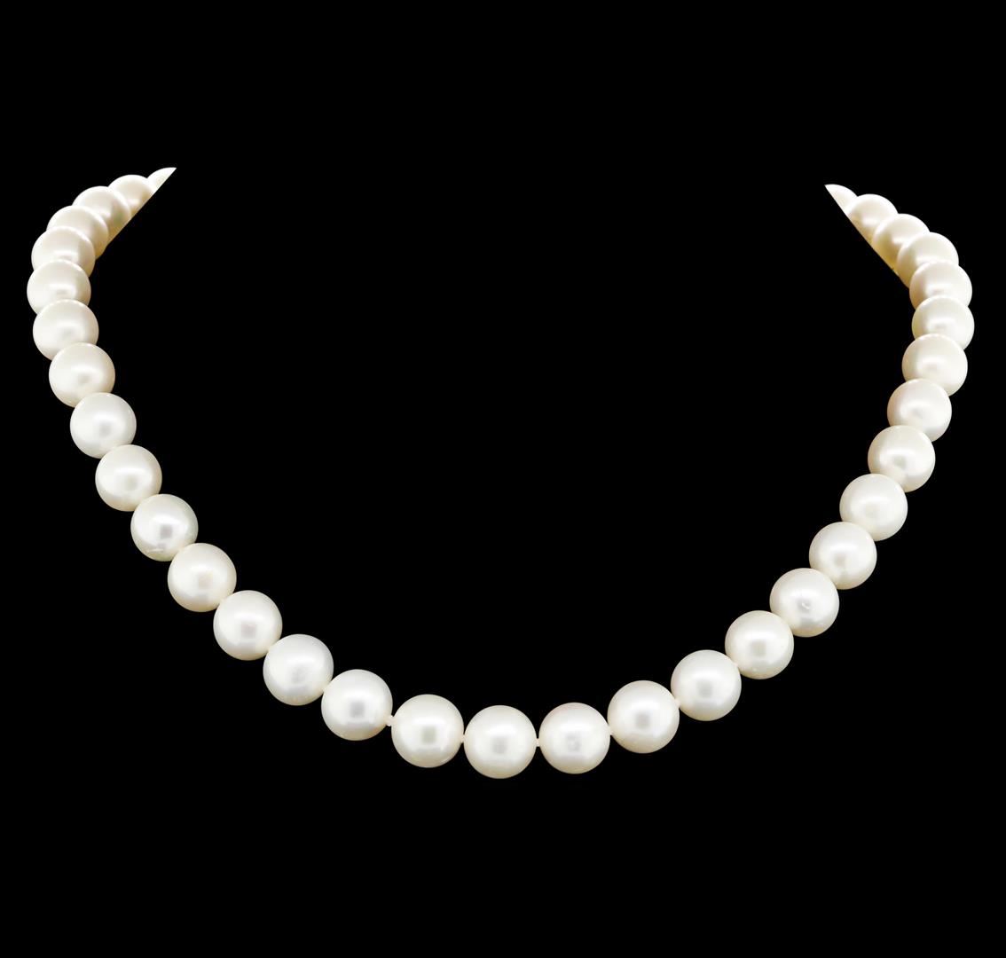 One 14KT White Gold 9mm Cultured Freshwater Pearl Necklace. 42 single strand cultured freshwater pearls with a size ranging from 9mm to 10mm.