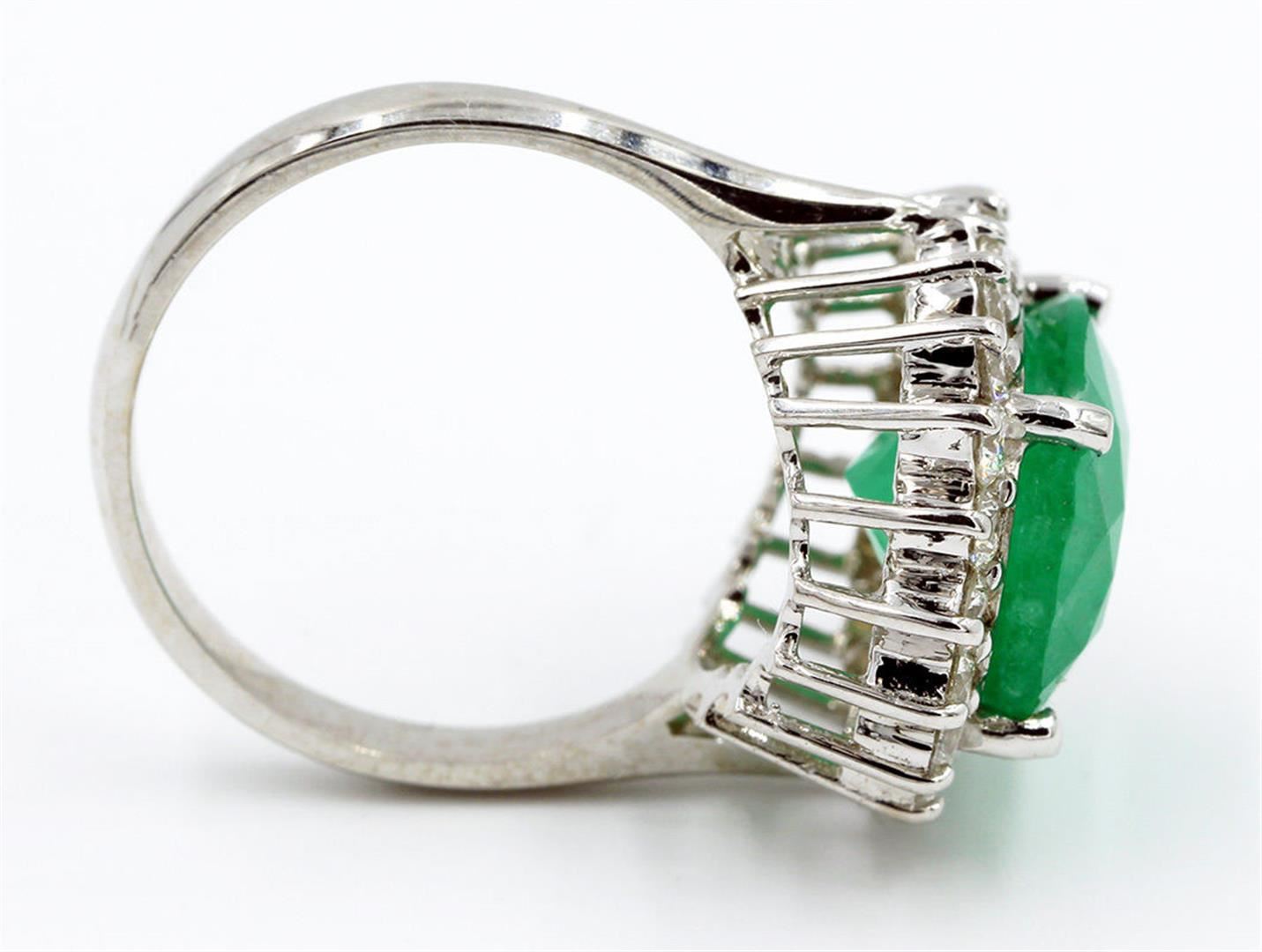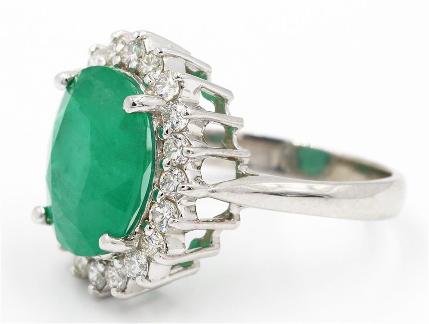 One Natural (Not-Enhanced) Oval Cut Emerald Diamond Wedding Engagement Ring in 14k White Gold. Size is 6.75 but able to resize, Total carat weight of ring is 6.91 Ct. The setting style is 4 prong with accent. The metal is white gold with 14k purity. Gross weight of the ring is 5.02 grams with a total of 21 stones. Condition is brand new. The main stone is non-enhanced / natural and is 6.00 carats. Stone shape is oval, fine bight clarity, and is natural emerald. Size approximation is 13.80 x 11.32 mm, main stone cut is excellent. Side stone is non-enhanced / natural and 0.91 carats. G-H color. Side diamond shape is brilliant round cut, with fine even color clarity. Side diamond color is natural emerald and cut is excellent. 20 total side diamonds.