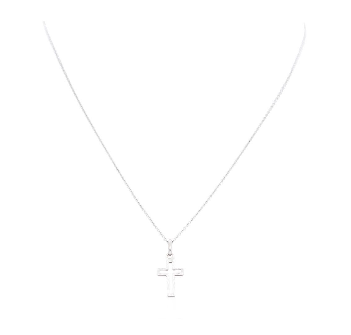 One cross pendant with chain featuring: 14KT white gold weighing 1.7 grams. The chain is a sixteen inch one millimeter rounded cable link chain.