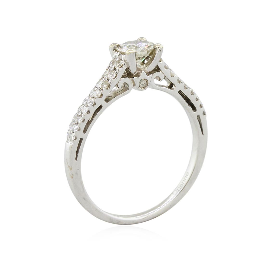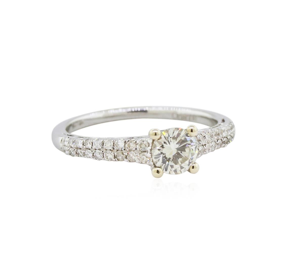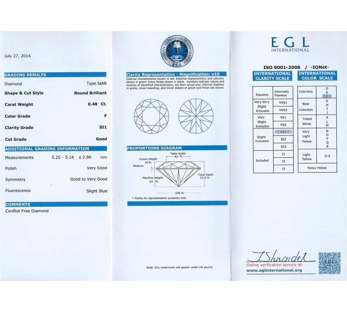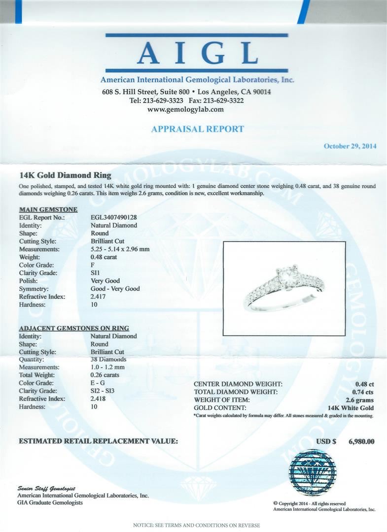 One polished, stamped and tested 14KT white gold ring mounted with: 1 genuine diamond center stone weighing 0.48 carats, and 38 genuine round diamonds weighing 0.26 carats. The centerstone has a color grade: F, clarity grade: SI1, adjacent diamonds have a color grade: E-G, clarity grade: SI2-SI3. This item weighs 3.3 grams, condition is new and workmanship is excellent. AIGL Appraised at $6,980.00.