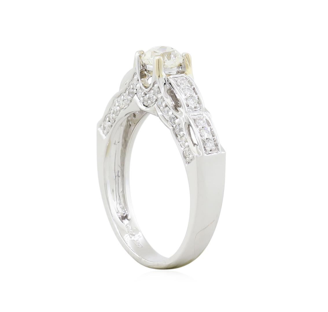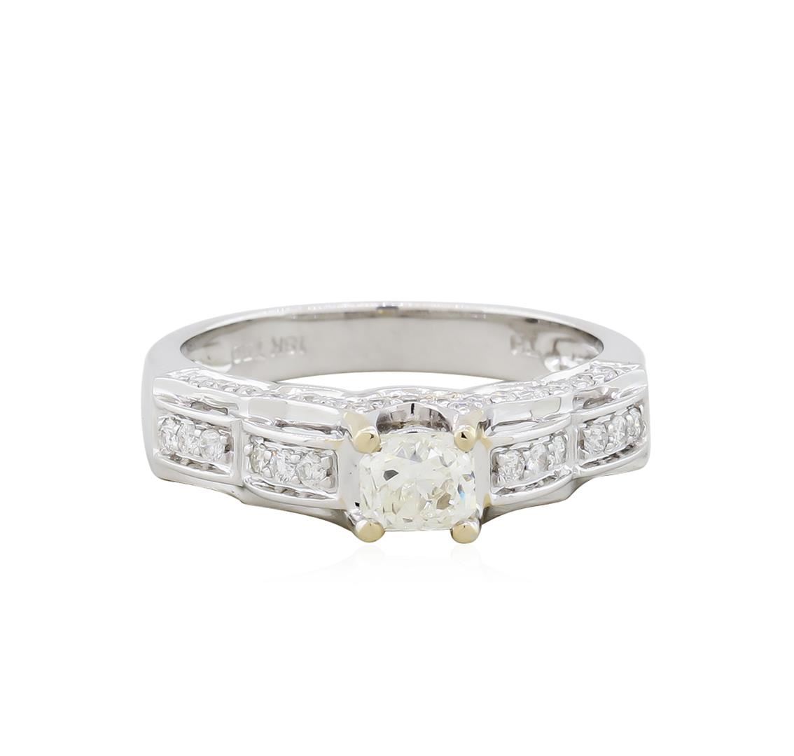One polished, stamped and tested 18KT white gold ladies cast diamond unity ring with bright polish finish. Condition is new, good workmanship. 1 genuine brilliant cut diamond center stone weighing 0.51 carats, and 46 genuine brilliant cut round diamonds weighing 0.37 carats. The centerstone meausres 4.65 x 4.00 x 3.00mm., Color is F, clarity is SI2. 46 accent diamonds clarity is SI2-I2, color F-G. This item weighs 4.9 grams, condition is new and workmanship is excellent. AIGL Appraised at $6,550.00.