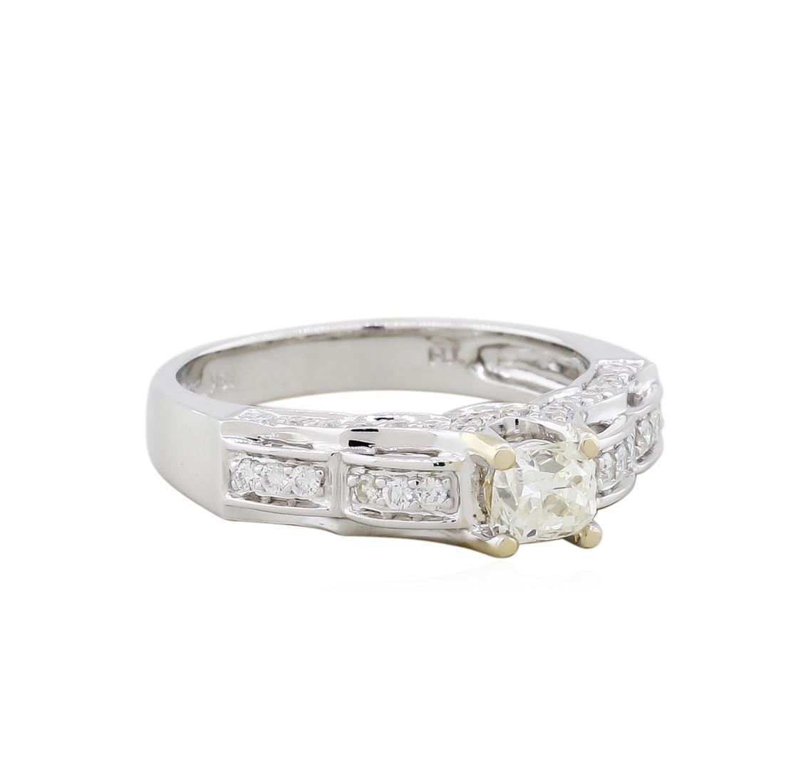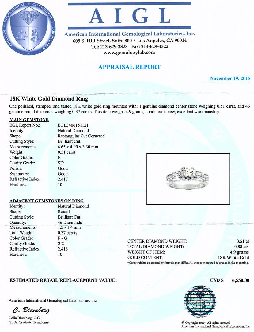 One polished, stamped and tested 18KT white gold ladies cast diamond unity ring with bright polish finish. Condition is new, good workmanship. 1 genuine brilliant cut diamond center stone weighing 0.51 carats, and 46 genuine brilliant cut round diamonds weighing 0.37 carats. The centerstone meausres 4.65 x 4.00 x 3.00mm., Color is F, clarity is SI2. 46 accent diamonds clarity is SI2-I2, color F-G. This item weighs 4.9 grams, condition is new and workmanship is excellent. AIGL Appraised at $6,550.00.