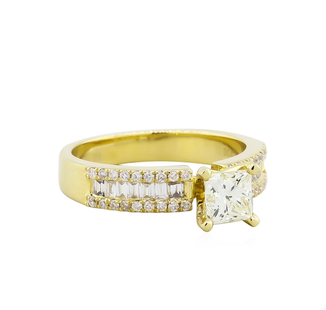 One electronically tested 18KT yellow gold ladies cast diamond unity ring with a bright polish finish. The featured diamond is supported by diamond set shoulders, completed by a three millimeter wide band. Identified with markings of "18K 750". Condition is new, good workmanship. Containing: One prong set princess cut diamond, measuring 4.98 x 4.97 x 4.01mm exact weight 0.86ct. EGL Report attached. Laser inscribed GSL 218351. Graded loose prior to setting in the EGL Laboratory Report #US 905792213D. Clarity: VS-1. Color: KDepth 80.7%. Table 71.4%. Pavil. Depth%. 62.6%. Crown Angle 47.1 Degrees Forty-Eight prong and channel set round brilliant & baguette cut diamonds approximate. Total Weight of 48 Stones = 0.47ct. The clarity grade reflects the entire range of clarity for this group. Graded in the setting. Clarity: VS-1 to SI-2. Color: G - I. Total Weight of Diamonds 1.33ct. AIG Appraised at $7,075.00.