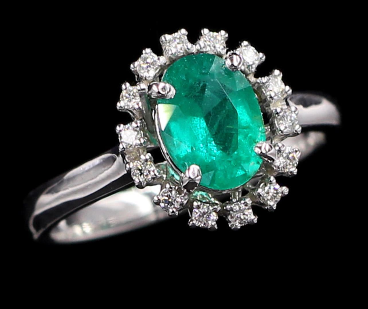 One Natural Emerald Oval Cut w/ Diamonds Ring in 14k White Gold. Total carat weight is 1.17 Ct. Size 6.5 but resizable. Setting style is solitaire with accents / halo design. Gross weight is 3.16 grams. Total stones is 15. Condition is brand new. Main stone is natural and non-enhanced. Main stone carat is 1.03 Ct, shape oval, clarity fine, color is dark color, cut is very good. Side stone is natural and non-enhanced, 0.14 Ct, shape is brilliant round cut, clarity SI-1, color G-H, cut is very good, and number of side diamonds is 14.
