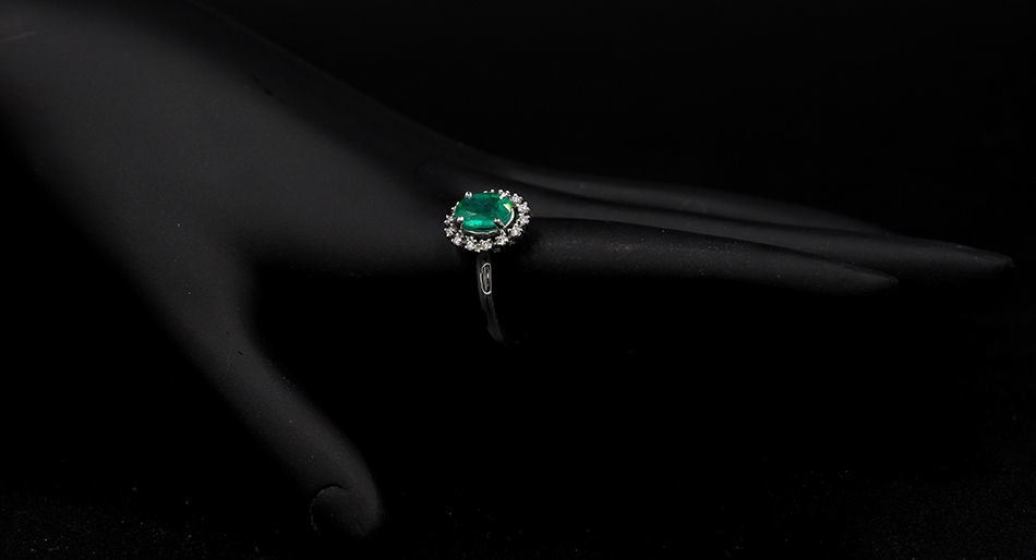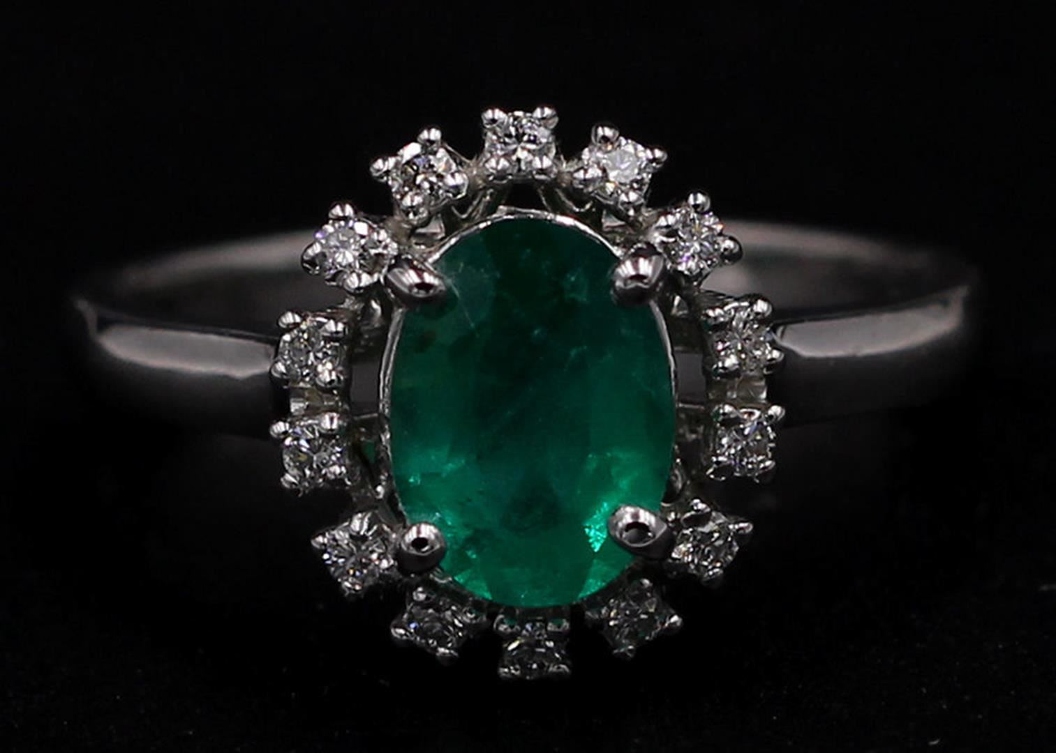 One Natural Emerald Oval Cut w/ Diamonds Ring in 14k White Gold. Total carat weight is 1.17 Ct. Size 6.5 but resizable. Setting style is solitaire with accents / halo design. Gross weight is 3.16 grams. Total stones is 15. Condition is brand new. Main stone is natural and non-enhanced. Main stone carat is 1.03 Ct, shape oval, clarity fine, color is dark color, cut is very good. Side stone is natural and non-enhanced, 0.14 Ct, shape is brilliant round cut, clarity SI-1, color G-H, cut is very good, and number of side diamonds is 14.