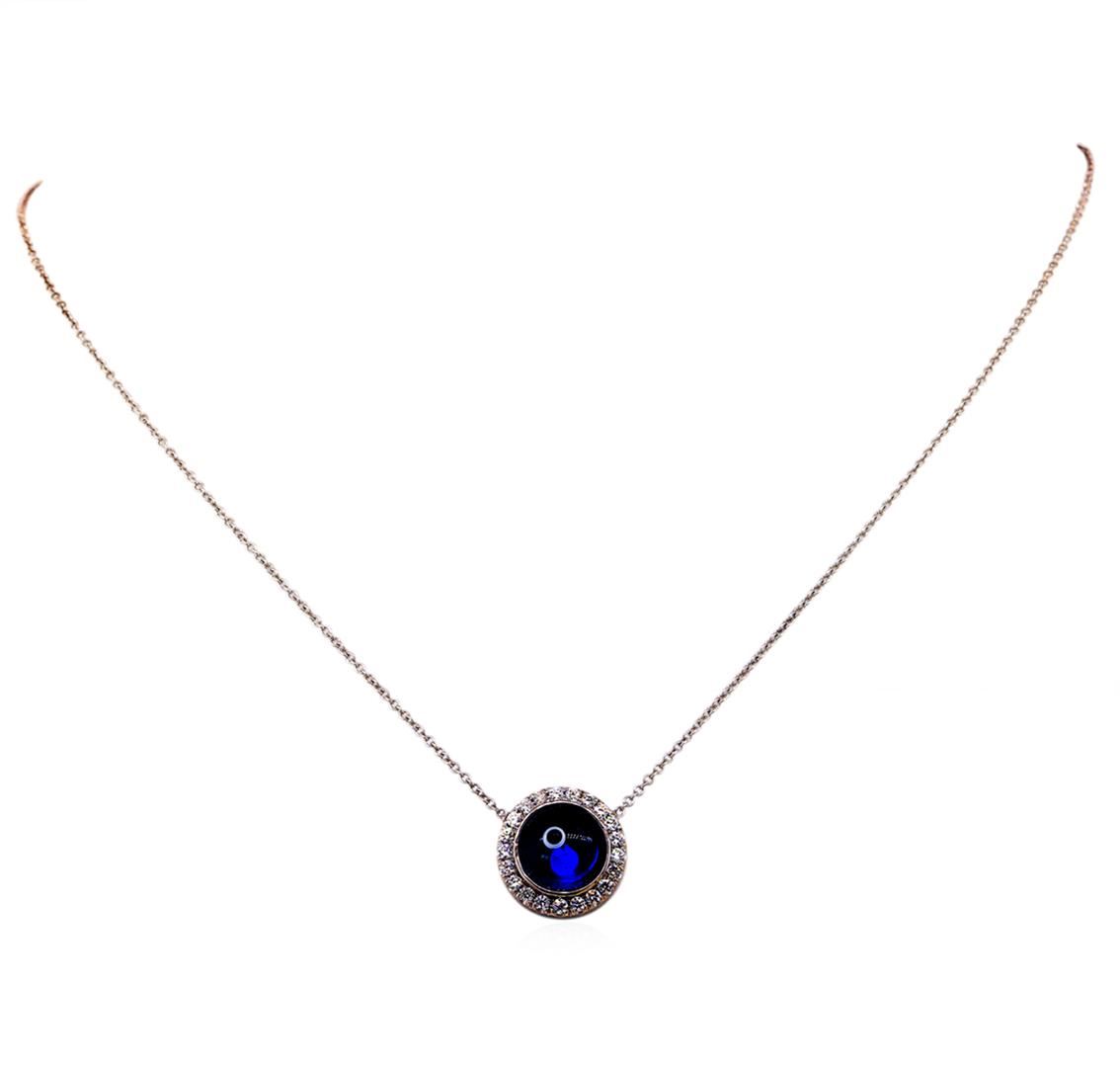 One electronically tested 14KT white gold lady's combination cast & assembled fashion necklace with a lobster claw clasp with a bright polish finish. The featured lady's necklace has an "evil eye" motif and has a 1.2 millimeter round cable link chain measuring 16 inches in length. Identified with markings of "14K". Condition is new, good workmanship. Containing: Twenty-One prong set round brilliant cut diamonds, measuring 1.70 - 1.65 x 1.02mm (depth est.) approximate. Total Weight of 21 Stones = 0.37ct. Graded in the setting. Clarity: VS-2 to SI-1. Color: H - I, Cut Very Good. Total Weight of Diamonds 0.37ct. Total Weight of Necklace 4.80gm. GAS Appraised at $1,660.00.