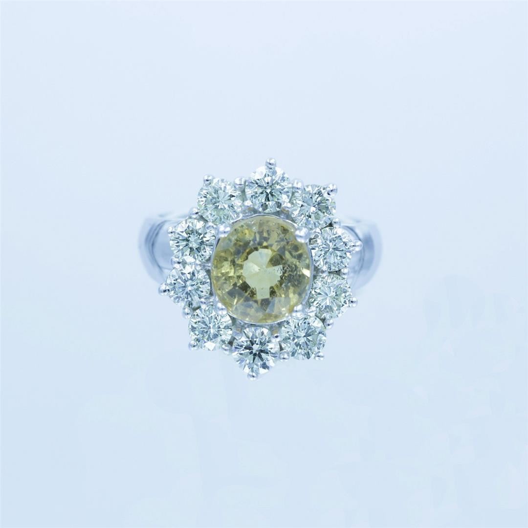 One Fashion Sunflower Citrine and Diamond in 14k White Gold. Size 6.75 but resizable. The diamond shape in this ring is round brilliant cut. Condition is brand new. Total citrine carat weight is 3.00 Ct. Citrine height 9.12 MM. Side diamonds total carats is 2.50 Ct. Diamond color I, clarity VS2-SI1, total number of diamonds 10. Gross gram weight is 9.15 grams.