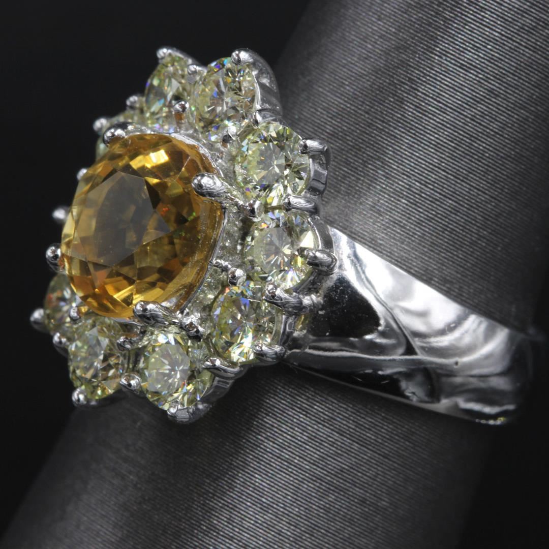 One Fashion Sunflower Citrine and Diamond in 14k White Gold. Size 6.75 but resizable. The diamond shape in this ring is round brilliant cut. Condition is brand new. Total citrine carat weight is 3.00 Ct. Citrine height 9.12 MM. Side diamonds total carats is 2.50 Ct. Diamond color I, clarity VS2-SI1, total number of diamonds 10. Gross gram weight is 9.15 grams.