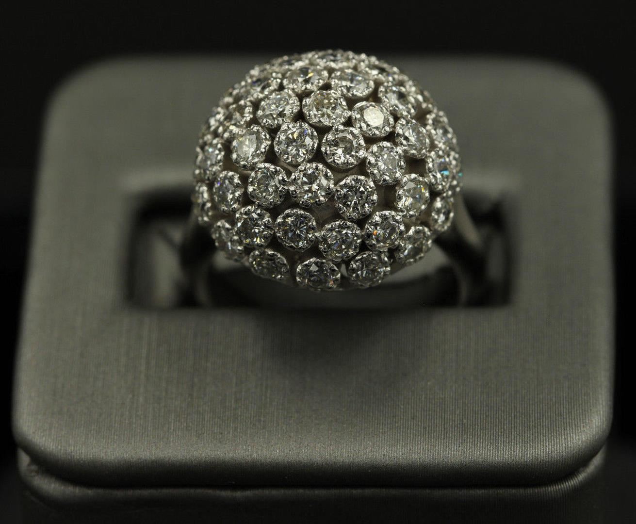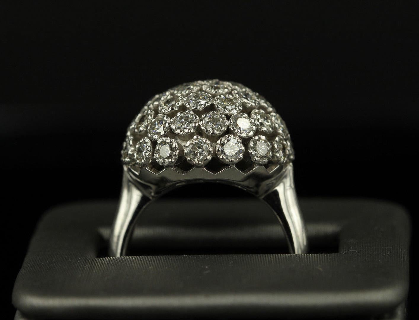 One Flower Design Ring in 14K White Gold. The total stone weight of this ring is 2.50 Ct. Size 6 but can be resized. Setting style is fashion. Gold weight is10.58 grams with a total of 50 stones. Condition is brand new. Main stone is natural and non-enhanced, round brilliant cut, clarity SI1, G-H color, and excellent cut.