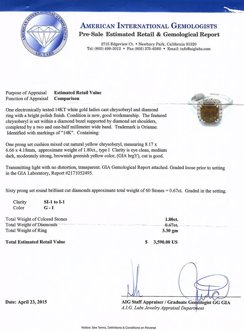 One electronically tested 14KT white gold ladies cast chrysoberyl and diamond ring with a bright polish finish. The featured chrysoberyl is set within a diamond bezel supported by diamond set shoulders, completed by a two and one-half millimeter wide band. Trademark is Orianne. Identified with markings of "14K". Condition is new, good workmanship. Containing: One prong set cushion mixed cut natural yellow chrysoberyl, measuring 8.17 x 6.66 x 4.18mm, approximate weight of 1.80ct., type I Clarity is eye clean, medium dark, moderately strong, brownish greenish yellow color, (GIA brgY), cut is good.Transmitting light with no distortion, transparent. GIA Gemological Report attached. Graded loose prior to setting in the GIA Laboratory, Report #2171052495.Sixty prong set round brilliant cut diamonds approximate. Total Weight of 60 Stones = 0.67ct. Graded in the setting. Clarity: SI-1 to I-1. Color: G - I. Total Weight of Colored Stones 1.80ct. Total Weight of Diamonds 0.67ct. AIG Appraised at $3,590.00.