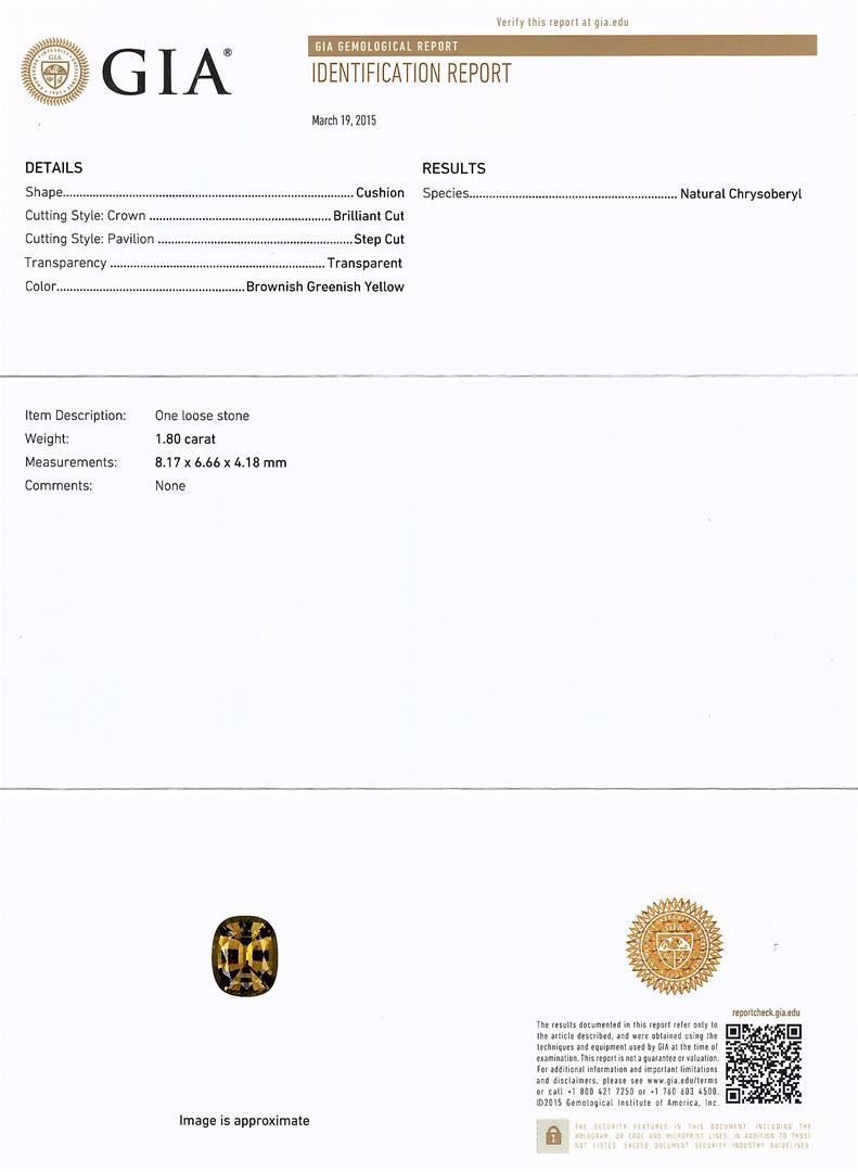 One electronically tested 14KT white gold ladies cast chrysoberyl and diamond ring with a bright polish finish. The featured chrysoberyl is set within a diamond bezel supported by diamond set shoulders, completed by a two and one-half millimeter wide band. Trademark is Orianne. Identified with markings of "14K". Condition is new, good workmanship. Containing: One prong set cushion mixed cut natural yellow chrysoberyl, measuring 8.17 x 6.66 x 4.18mm, approximate weight of 1.80ct., type I Clarity is eye clean, medium dark, moderately strong, brownish greenish yellow color, (GIA brgY), cut is good.Transmitting light with no distortion, transparent. GIA Gemological Report attached. Graded loose prior to setting in the GIA Laboratory, Report #2171052495.Sixty prong set round brilliant cut diamonds approximate. Total Weight of 60 Stones = 0.67ct. Graded in the setting. Clarity: SI-1 to I-1. Color: G - I. Total Weight of Colored Stones 1.80ct. Total Weight of Diamonds 0.67ct. AIG Appraised at $3,590.00.