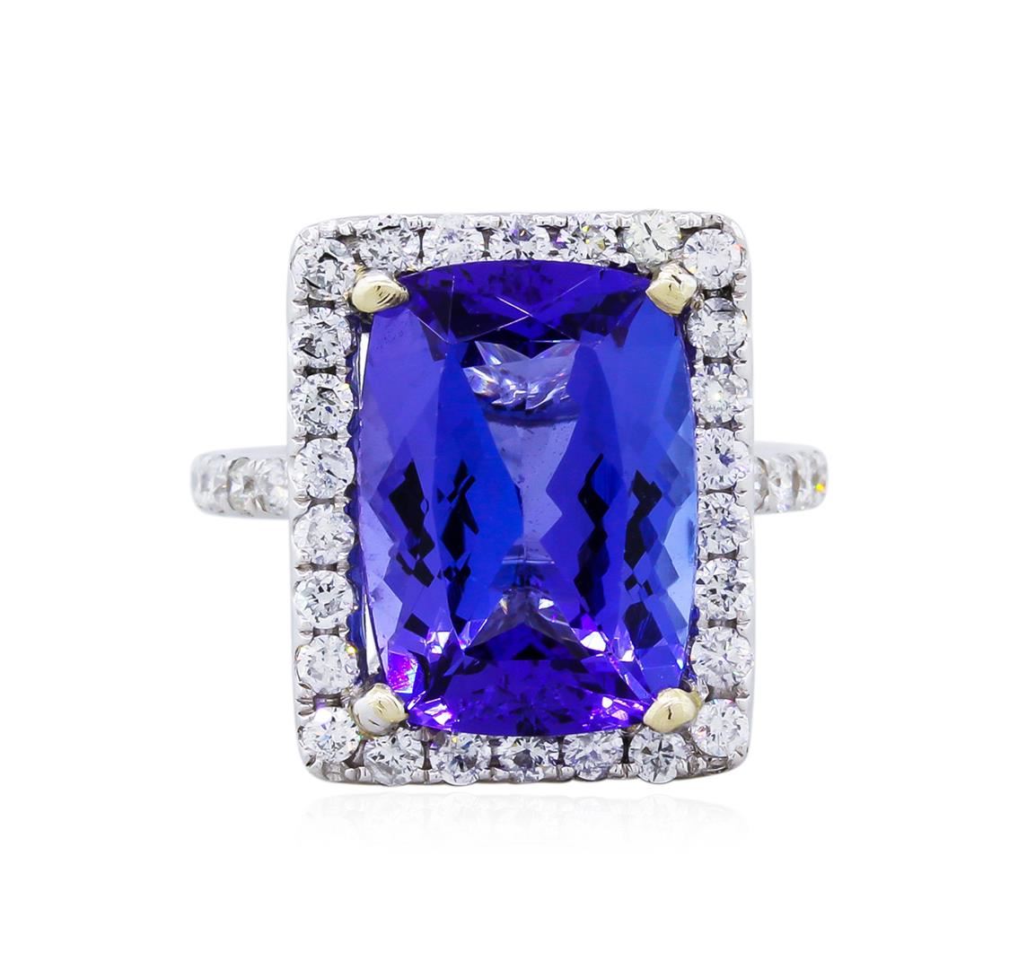 One electronically tested 14KT white gold ladies cast tanzanite and diamond ring with a bright polish finish. The featured tanzanite is set within a diamond bezel supported by a diamond set under gallery and diamond set shoulders, completed by a two millimeter wide band. Trademark is Orianne. Identified with markings of "14K". Condition is new, good workmanship. Containing: One prong set cushion modified brilliant cut natural tanzanite, measuring 15.25 x 10.91 x 7.03mm, exact weight 9.26ct., type I Clarity is eye clean, dark, moderately strong, blue-violet color, (GIA BV), cut is good. Transmitting light with no distortion, transparent. GIA Gemological Report attached. Graded loose prior to setting in theGIA Laboratory, Report #1166725885.Tanzanite is a very rare gemstone that is only found in the country of Tanzania. Originally discovered in 1967. Tiffany & Company, named the stone Tanzanite. It is found in the Usumburu Mountains that border the Umba Valley of northern Tanzania. Tanzanite occurs in gray, brown, violet, blue, reddish-purple, & green. The gem is interesting because of its exceptional pleochroism. Rotated in different directions a tanzanite will exhibit multiple changes of color. Tanzanite has a low tolerance to ultrasonic cleaning, and should not be cleaned using this method.Sixty prong set round brilliant cut diamonds, measuring 2.00 - 1.70 x 1.11mm (depth est.) approximate. Total Weight of 60 Stones = 1.44ct. Graded in the setting. Clarity: SI-1 to I-1. Color: G - I. Total Weight of Colored Stones 9.26ct. Total Weight of Diamonds 1.44ct. AIG Appraised at $28,080.00.