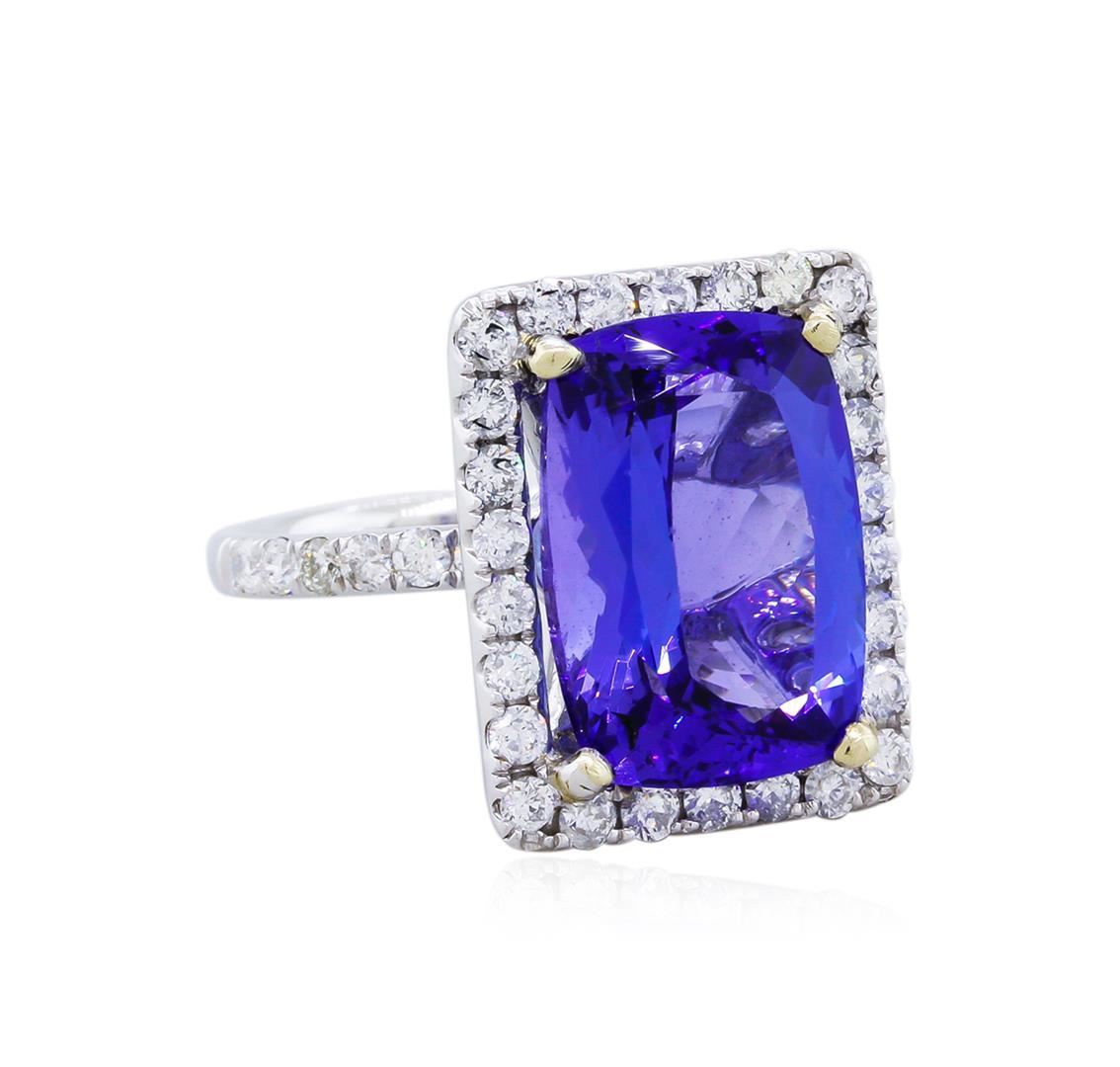 One electronically tested 14KT white gold ladies cast tanzanite and diamond ring with a bright polish finish. The featured tanzanite is set within a diamond bezel supported by a diamond set under gallery and diamond set shoulders, completed by a two millimeter wide band. Trademark is Orianne. Identified with markings of "14K". Condition is new, good workmanship. Containing: One prong set cushion modified brilliant cut natural tanzanite, measuring 15.25 x 10.91 x 7.03mm, exact weight 9.26ct., type I Clarity is eye clean, dark, moderately strong, blue-violet color, (GIA BV), cut is good. Transmitting light with no distortion, transparent. GIA Gemological Report attached. Graded loose prior to setting in theGIA Laboratory, Report #1166725885.Tanzanite is a very rare gemstone that is only found in the country of Tanzania. Originally discovered in 1967. Tiffany & Company, named the stone Tanzanite. It is found in the Usumburu Mountains that border the Umba Valley of northern Tanzania. Tanzanite occurs in gray, brown, violet, blue, reddish-purple, & green. The gem is interesting because of its exceptional pleochroism. Rotated in different directions a tanzanite will exhibit multiple changes of color. Tanzanite has a low tolerance to ultrasonic cleaning, and should not be cleaned using this method.Sixty prong set round brilliant cut diamonds, measuring 2.00 - 1.70 x 1.11mm (depth est.) approximate. Total Weight of 60 Stones = 1.44ct. Graded in the setting. Clarity: SI-1 to I-1. Color: G - I. Total Weight of Colored Stones 9.26ct. Total Weight of Diamonds 1.44ct. AIG Appraised at $28,080.00.