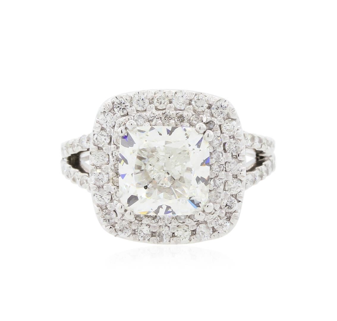 One electronically tested 14KT white gold lady's cast wedding ring with a split shank halo with a bright polish finish. The featured lady's ring has a shank measuring 2.35 millimeters wide. Identified with markings of "14K". Condition is new, good workmanship. Containing: One prong set cushion cut diamond, measuring 7.93 x 7.79 x 5.39mm (depth est.) , 6.00.%. GTCF approximate weight of 3.01ct. Graded loose prior to setting in the GIA Laboratory, Report #2198657970. Clarity: SI-2. Color: H. Cut Very Good Twenty-Three prong set round brilliant cut diamonds, measuring 1.50 - 1.40 x 0.94mm (depth est.) approximate total weight of 23 Stones = 0.28ct. Graded in the setting. Clarity: SI-1 to I-1. Color: G - Good Fifty-Six prong set round brilliant cut diamonds, measuring 1.30 - 1.20 x 0.81mm (depth est.) approximate total weight of 56 Stones = 0.43ct. Graded in the setting. Clarity: SI-1 to I-1. Color: G - Good. Total Weight of Diamonds 3.72ct. Total Weight of Ring 6.30gm. GAS Appraised at $68,800.00.