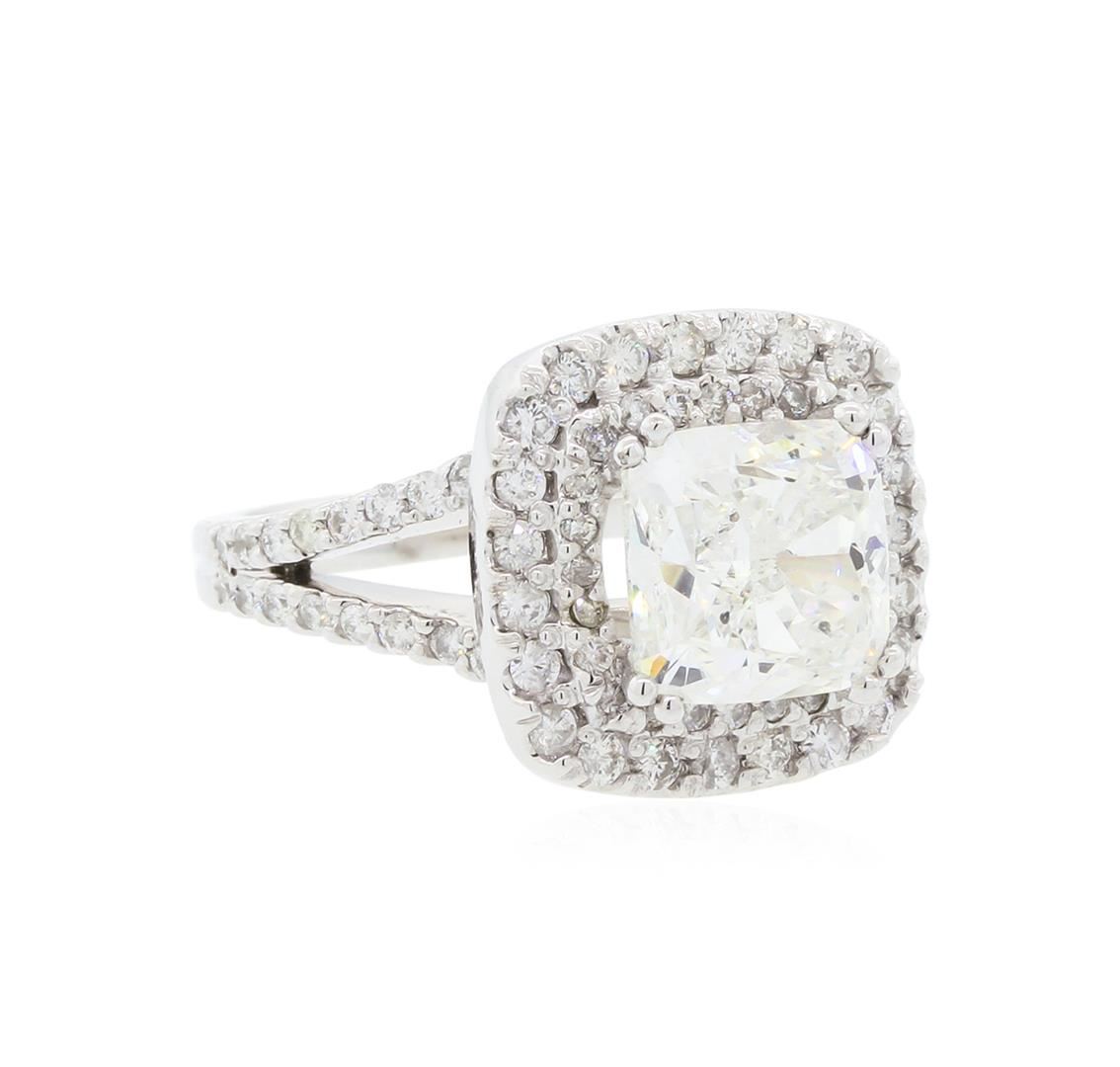 One electronically tested 14KT white gold lady's cast wedding ring with a split shank halo with a bright polish finish. The featured lady's ring has a shank measuring 2.35 millimeters wide. Identified with markings of "14K". Condition is new, good workmanship. Containing: One prong set cushion cut diamond, measuring 7.93 x 7.79 x 5.39mm (depth est.) , 6.00.%. GTCF approximate weight of 3.01ct. Graded loose prior to setting in the GIA Laboratory, Report #2198657970. Clarity: SI-2. Color: H. Cut Very Good Twenty-Three prong set round brilliant cut diamonds, measuring 1.50 - 1.40 x 0.94mm (depth est.) approximate total weight of 23 Stones = 0.28ct. Graded in the setting. Clarity: SI-1 to I-1. Color: G - Good Fifty-Six prong set round brilliant cut diamonds, measuring 1.30 - 1.20 x 0.81mm (depth est.) approximate total weight of 56 Stones = 0.43ct. Graded in the setting. Clarity: SI-1 to I-1. Color: G - Good. Total Weight of Diamonds 3.72ct. Total Weight of Ring 6.30gm. GAS Appraised at $68,800.00.