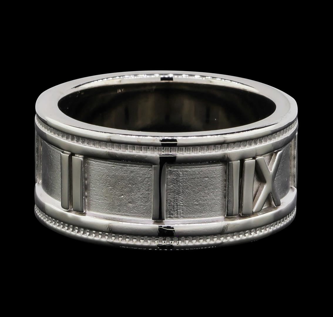 One Ladies designer George Carter Jessop wide band roman numeral ring featuring: 14KT white gold weighing 14.3 grams, marked with "GCJ" and "14K".