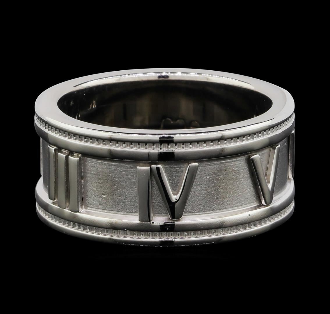 One Ladies designer George Carter Jessop wide band roman numeral ring featuring: 14KT white gold weighing 14.3 grams, marked with "GCJ" and "14K".
