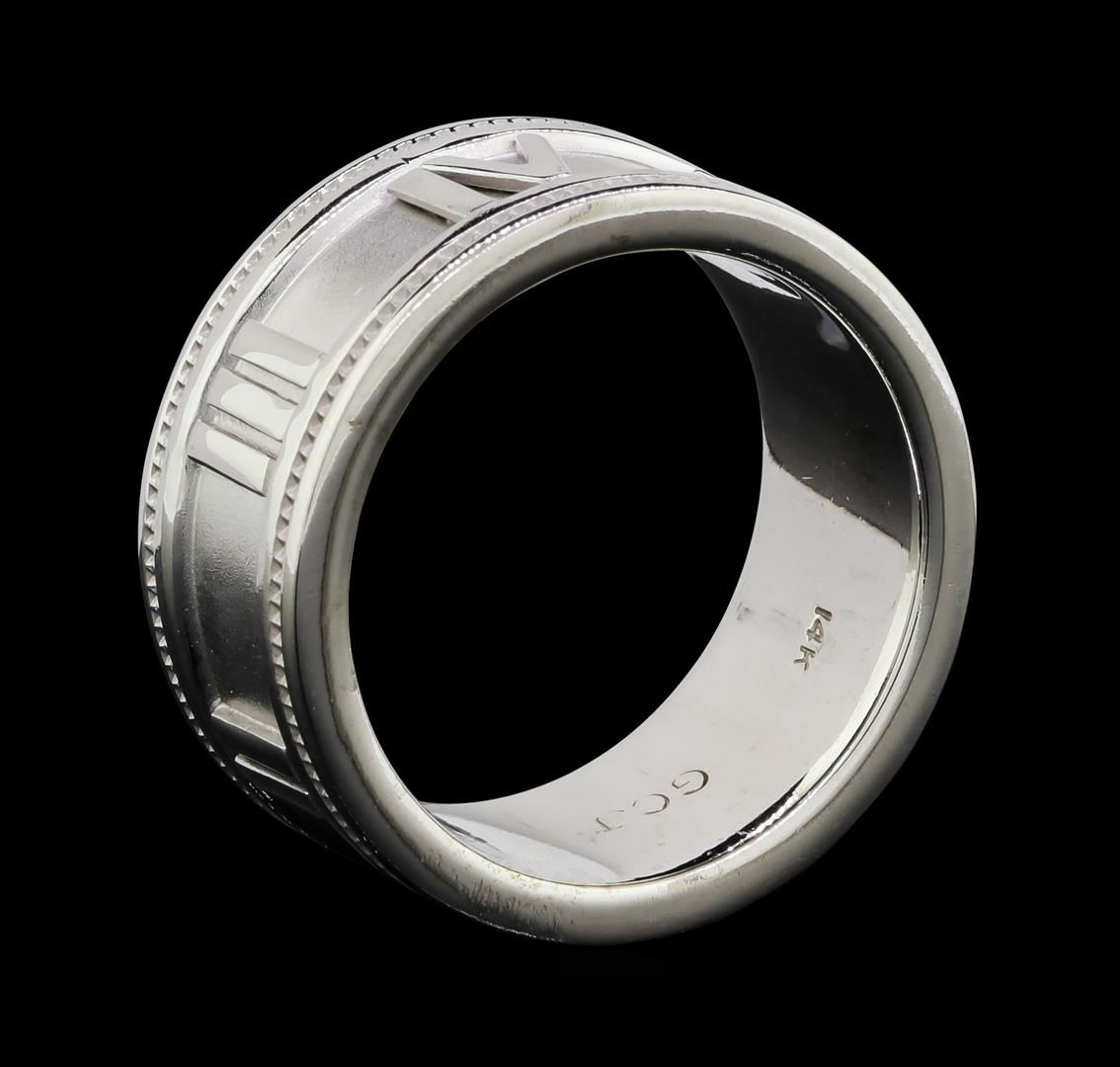 One Ladies designer George Carter Jessop wide band roman numeral ring featuring: 14KT white gold weighing 14.3 grams, marked with "GCJ" and "14K".