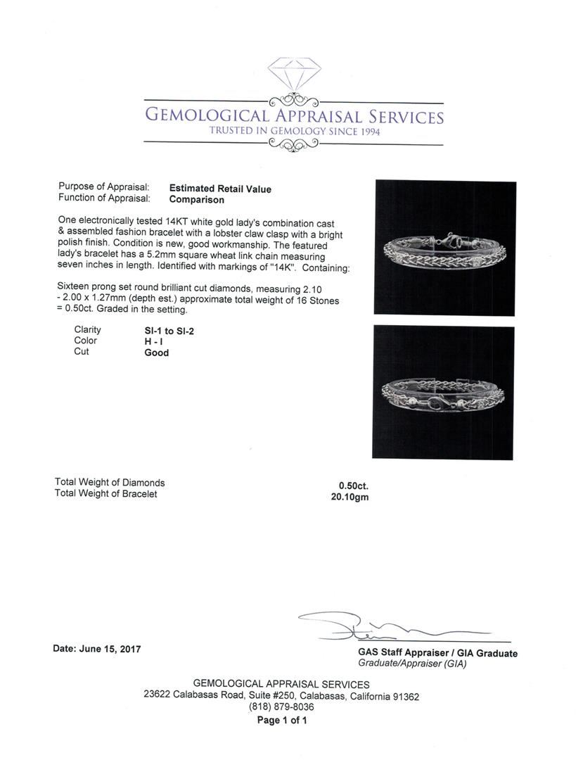 One electronically tested 14KT white gold lady's combination cast & assembled fashion bracelet with a lobster claw clasp with a bright polish finish. The featured lady's bracelet has a 5.2mm square wheat link chain measuring seven inches in length. Identified with markings of '14K'. Condition is new, good workmanship. Containing: Sixteen prong set round brilliant cut diamonds, measuring 2.10 - 2.00 x 1.27mm (depth est.) approximate total weight of 16 Stones = 0.50ct. Graded in the setting. Color H - I Clarity SI-1 to SI-2 Cut Good. Total Weight of Diamonds 0.50ct.. Total Weight of Bracelet 20.10gm GAS Appraised.