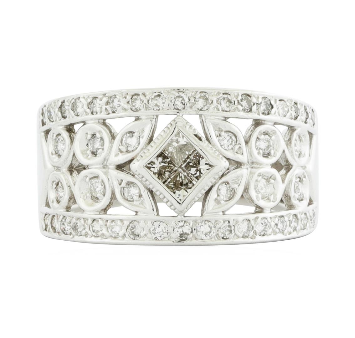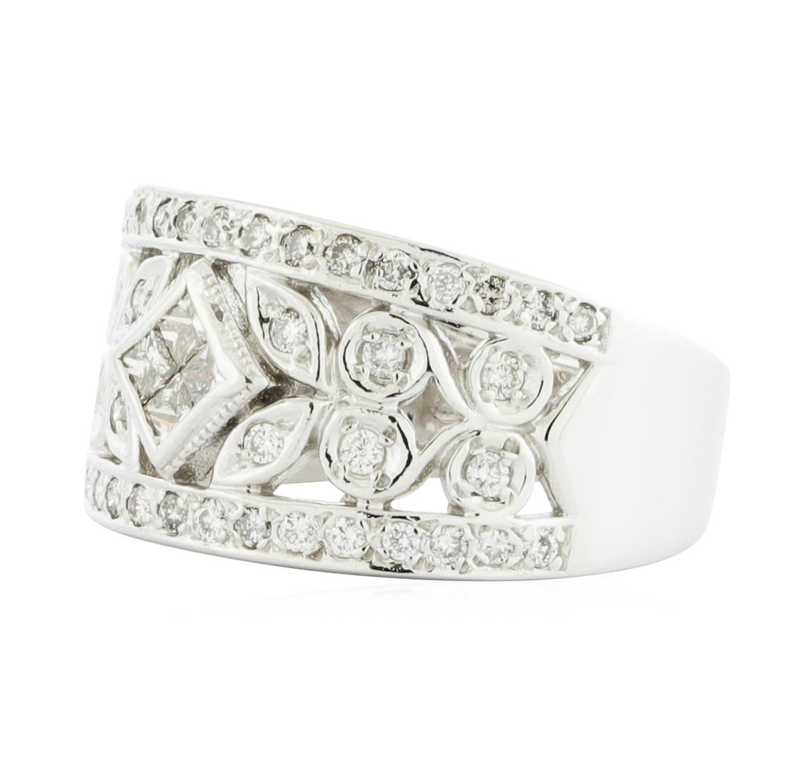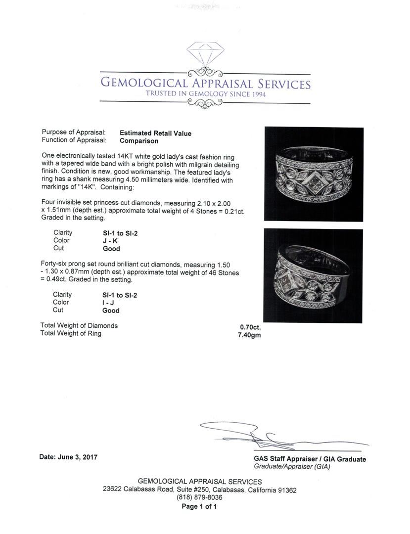One electronically tested 14KT white gold lady's cast fashion ring with a tapered wide band with a bright polish with milgrain detailing finish. The featured lady's ring has a shank measuring 4.50 millimeters wide. Identified with markings of '14K'. Condition is new, good workmanship. Containing: Four invisible set princess cut diamonds, measuring 2.10 x 2.00 x 1.51mm (depth est.) approximate total weight of 4 Stones = 0.21ct. Graded in the setting. Color J - K Clarity SI-1 to SI-2 Cut Good Forty-Six prong set round brilliant cut diamonds, measuring 1.50 - 1.30 x 0.87mm (depth est.) approximate total weight of 46 Stones = 0.49ct. Graded in the setting. Color I - J Clarity SI-1 to SI-2 Cut Good. Total Weight of Diamonds 0.70ct.. Total Weight of Ring 7.40gm GAS Appraised.