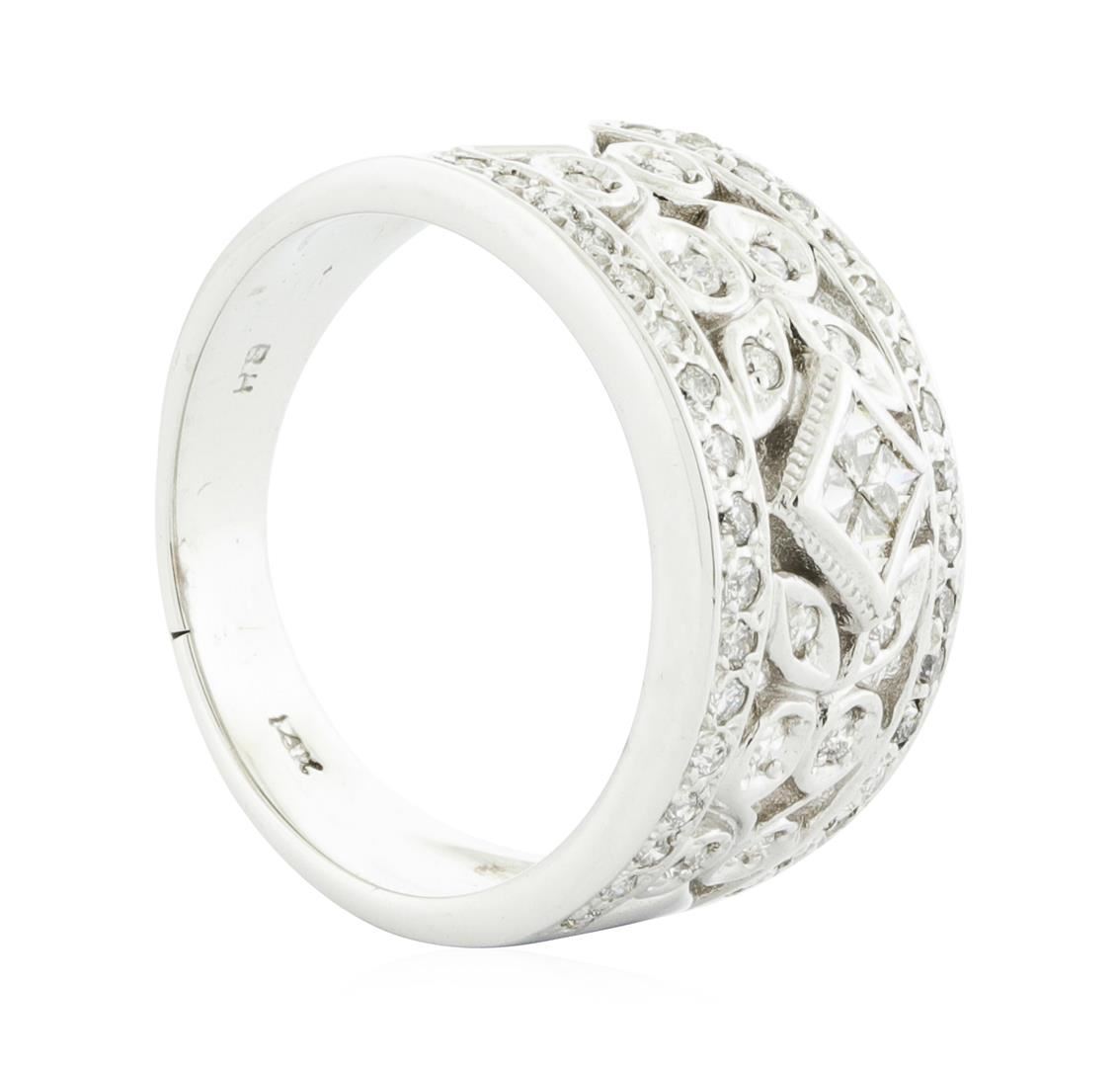 One electronically tested 14KT white gold lady's cast fashion ring with a tapered wide band with a bright polish with milgrain detailing finish. The featured lady's ring has a shank measuring 4.50 millimeters wide. Identified with markings of '14K'. Condition is new, good workmanship. Containing: Four invisible set princess cut diamonds, measuring 2.10 x 2.00 x 1.51mm (depth est.) approximate total weight of 4 Stones = 0.21ct. Graded in the setting. Color J - K Clarity SI-1 to SI-2 Cut Good Forty-Six prong set round brilliant cut diamonds, measuring 1.50 - 1.30 x 0.87mm (depth est.) approximate total weight of 46 Stones = 0.49ct. Graded in the setting. Color I - J Clarity SI-1 to SI-2 Cut Good. Total Weight of Diamonds 0.70ct.. Total Weight of Ring 7.40gm GAS Appraised.