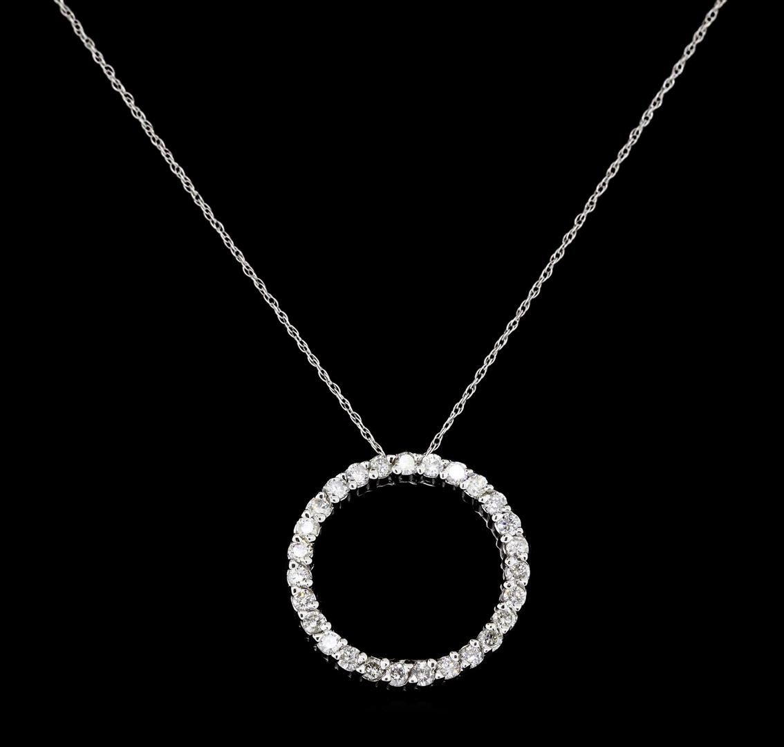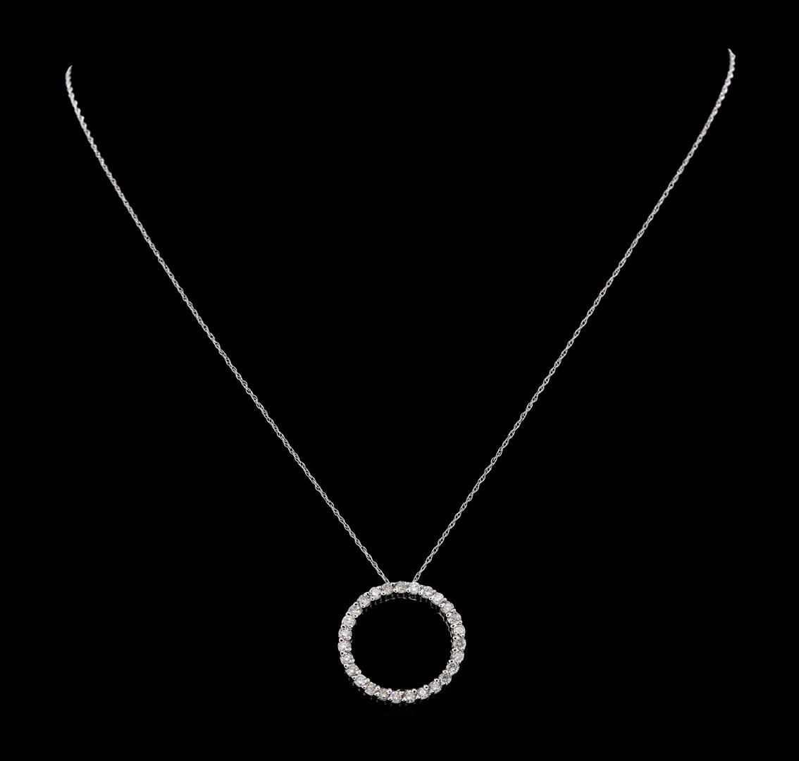 One Ladies diamond circle pendant with chain featuring: 14KT white gold weighing 4.0 grams containing diamonds weighing 0.75ctw. The 1mm loose rope chain measures approximately sixteen inches in length.
