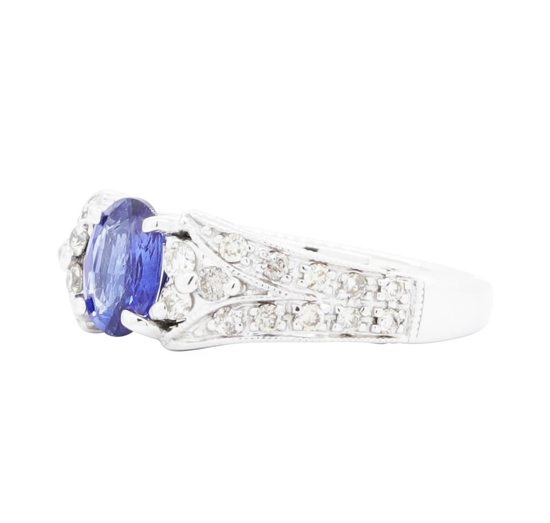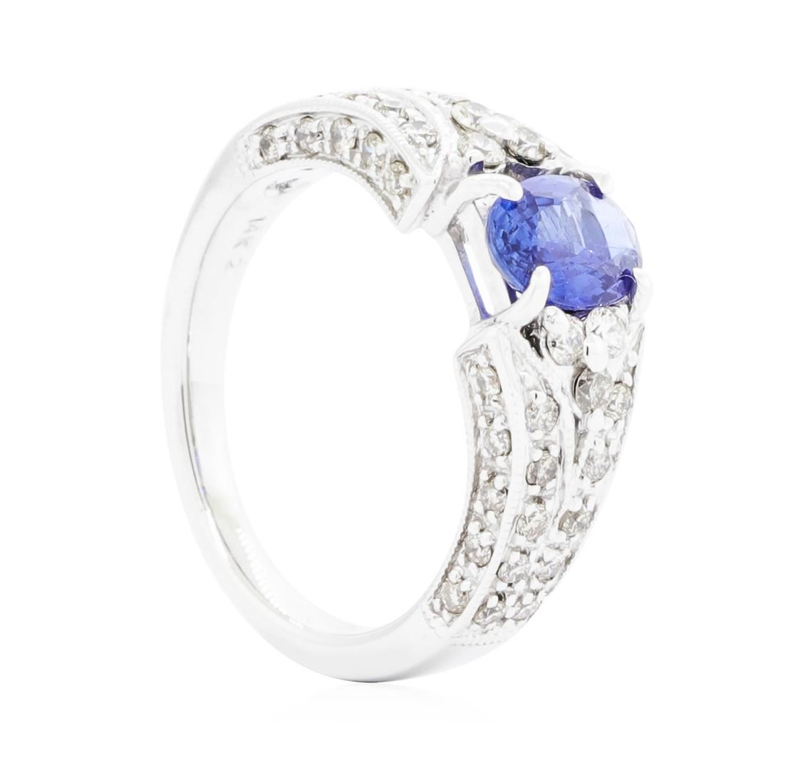 One electronically tested 14KT white gold lady's cast fashion ring with a tapered shank with a bright polish with milgrain detailing finish. The featured lady's ring has a shank measuring 2.31 millimeters wide. Identified with markings of '14K'. Condition is new, good workmanship. Containing: One prong set oval modified mixed cut natural blue sapphire, measuring 7.13 x 5.20 x 2.80mm, (depth est.) approximate weight of 0.87ct., clarity is slightly included, medium dark, moderately strong, blue color, (GIA B 6/4), cut is good. Transmitting light with a minimum of distortion, transparent. Colored gemstones are presumed to have been subjected to commonly used enhancement processes. Graded in the setting. Six prong set round brilliant cut diamonds, measuring 1.90 - 1.80 x 1.15mm (depth est.) approximate total weight of 6 Stones = 0.15ct. Graded in the setting. Color H - I Clarity SI-2 to I-1 Cut Good Forty prong set round brilliant cut diamonds, measuring 1.50 - 1.40 x 0.90mm (depth est.) approximate total weight of 40 Stones = 0.45ct. Graded in the setting. Color I - K Clarity SI-2 to I-1 Cut Good. Total Weight of Colored Stones 0.87ct.. Total Weight of Diamonds 0.60ct.. Total Weight of Ring 5.30gm GAS Appraised.