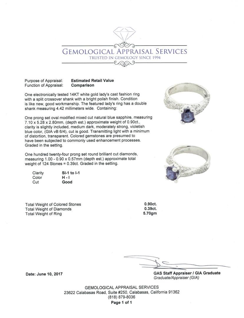 One electronically tested 14KT white gold lady's cast fashion ring with a split crossover shank with a bright polish finish. The featured lady's ring has a double shank measuring 4.42 millimeters wide. Condition is like new, good workmanship. Containing: One prong set oval modified mixed cut natural blue sapphire, measuring 7.10 x 5.28 x 2.80mm, (depth est.) approximate weight of 0.90ct., clarity is slightly included, medium dark, moderately strong, violetish blue color, (GIA vB 6/4), cut is good. Transmitting light with a minimum of distortion, transparent. Colored gemstones are presumed to have been subjected to commonly used enhancement processes. Graded in the setting. One Hundred Twenty-Four prong set round brilliant cut diamonds, measuring 1.00 - 0.90 x 0.57mm (depth est.) approximate total weight of 124 Stones = 0.39ct. Graded in the setting. Color H - I Clarity SI-1 to I-1 Cut Good. Total Weight of Colored Stones 0.90ct.. Total Weight of Diamonds 0.39ct.. Total Weight of Ring 5.70gm GAS Appraised.