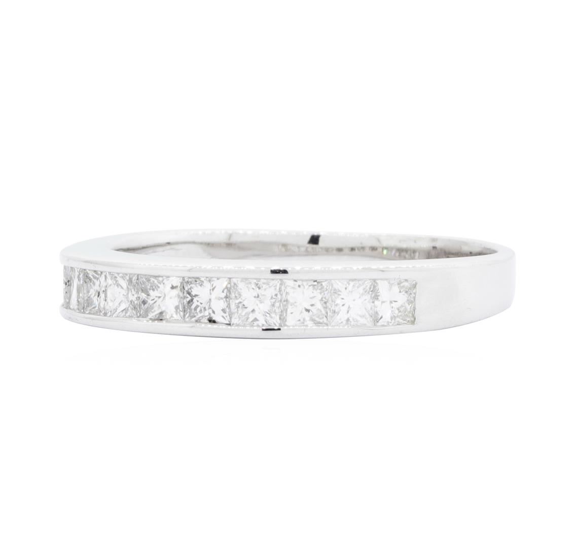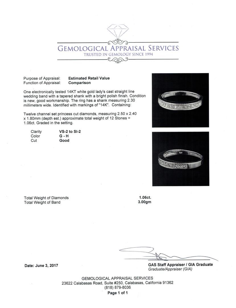 One electronically tested 14KT white gold lady's cast straight line wedding band with a tapered shank with a bright polish finish. The ring has a shank measuring 2.30 millimeters wide. Identified with markings of '14K'. Condition is new, good workmanship. Containing: Twelve channel set princess cut diamonds, measuring 2.50 x 2.40 x 1.80mm (depth est.) approximate total weight of 12 Stones = 1.06ct. Graded in the setting. Color G - H Clarity VS-2 to SI-2 Cut Good. Total Weight of Diamonds 1.06ct.. Total Weight of Band 3.00gm GAS Appraised.