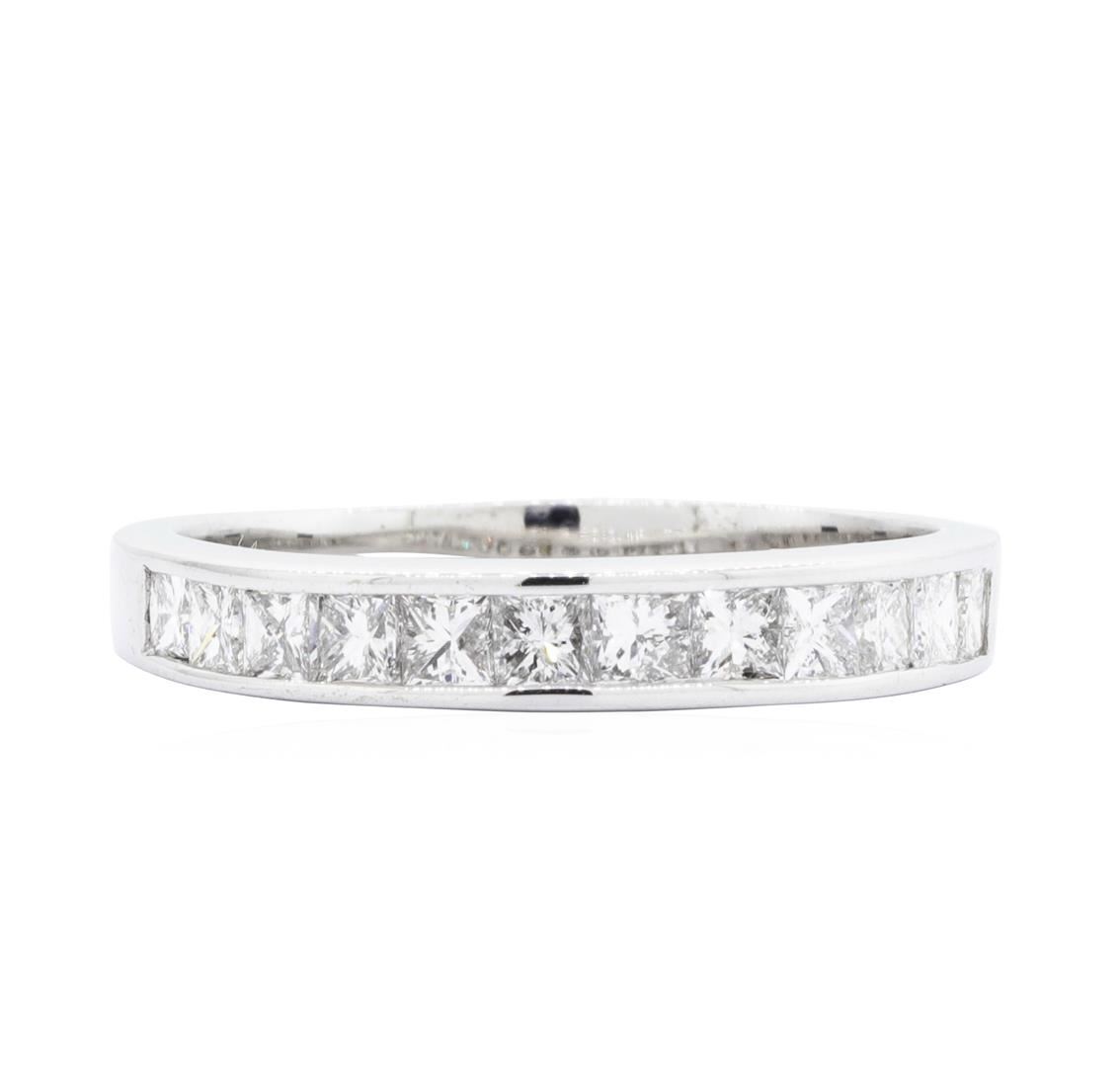 One electronically tested 14KT white gold lady's cast straight line wedding band with a tapered shank with a bright polish finish. The ring has a shank measuring 2.30 millimeters wide. Identified with markings of '14K'. Condition is new, good workmanship. Containing: Twelve channel set princess cut diamonds, measuring 2.50 x 2.40 x 1.80mm (depth est.) approximate total weight of 12 Stones = 1.06ct. Graded in the setting. Color G - H Clarity VS-2 to SI-2 Cut Good. Total Weight of Diamonds 1.06ct.. Total Weight of Band 3.00gm GAS Appraised.