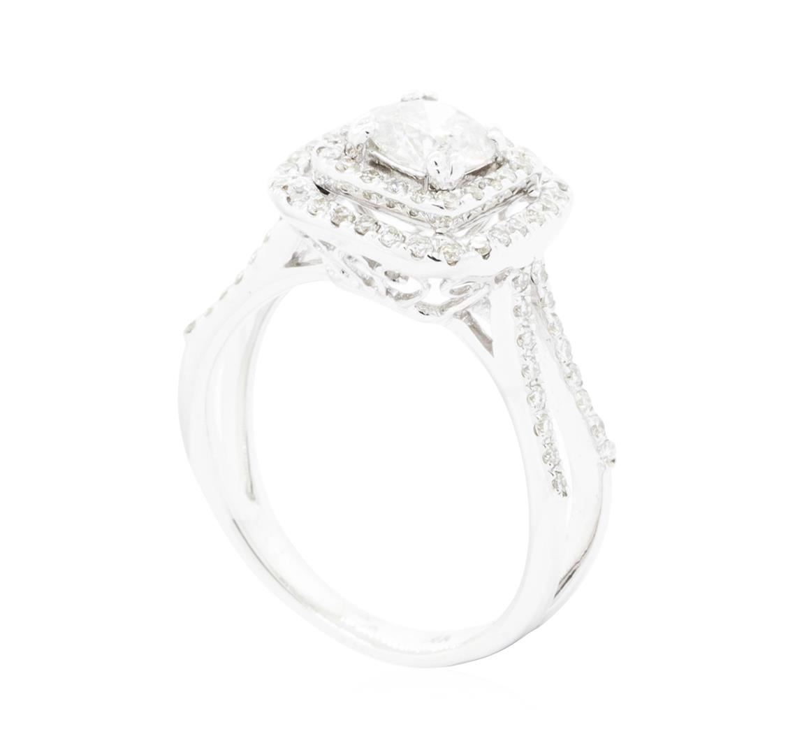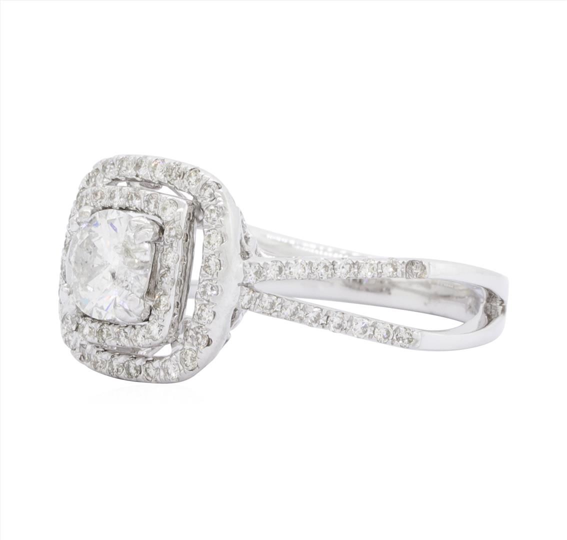One electronically tested 14KT white gold lady's cast wedding ring with a split shank double basket halo with a bright polish finish. The featured lady's ring has a shank measuring 2.39 millimeters wide. Identified with markings of '14K'. Condition is new, good workmanship. Containing: One prong set round brilliant cut diamond, measuring 5.53 - 5.48 x 3.34mm (depth est.) approximate weight of 0.65ct. Graded in the setting. Color H - I Clarity I-2 Cut Good Eighty prong set round brilliant cut diamonds, measuring 1.20 - 1.10 x 0.71mm (depth est.) approximate total weight of 80 Stones = 0.45ct. Graded in the setting. Color H - I Clarity SI-1 to I-1 Cut Good. Total Weight of Diamonds 1.10ct.. Total Weight of Ring 4.00gm GAS Appraised.