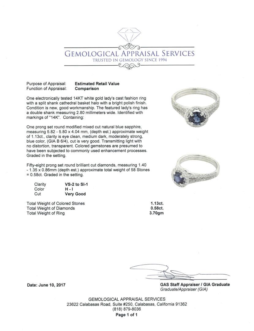 One electronically tested 14KT white gold lady's cast fashion ring with a split shank cathedral basket halo with a bright polish finish. The featured lady's ring has a double shank measuring 2.80 millimeters wide. Identified with markings of '14K'. Condition is new, good workmanship. Containing: One prong set round modified mixed cut natural blue sapphire, measuring 5.82 - 5.80 x 4.04 mm, (depth est.) approximate weight of 1.13ct., clarity is eye clean, medium dark, moderately strong, blue color, (GIA B 6/4), cut is very good. Transmitting light with no distortion, transparent. Colored gemstones are presumed to have been subjected to commonly used enhancement processes. Graded in the setting. Fifty-Eight prong set round brilliant cut diamonds, measuring 1.40 - 1.35 x 0.86mm (depth est.) approximate total weight of 58 Stones = 0.58ct. Graded in the setting. Color H - I Clarity VS-2 to SI-1 Cut Very Good. Total Weight of Colored Stones 1.13ct.. Total Weight of Diamonds 0.58ct.. Total Weight of Ring 3.70gm GAS Appraised.