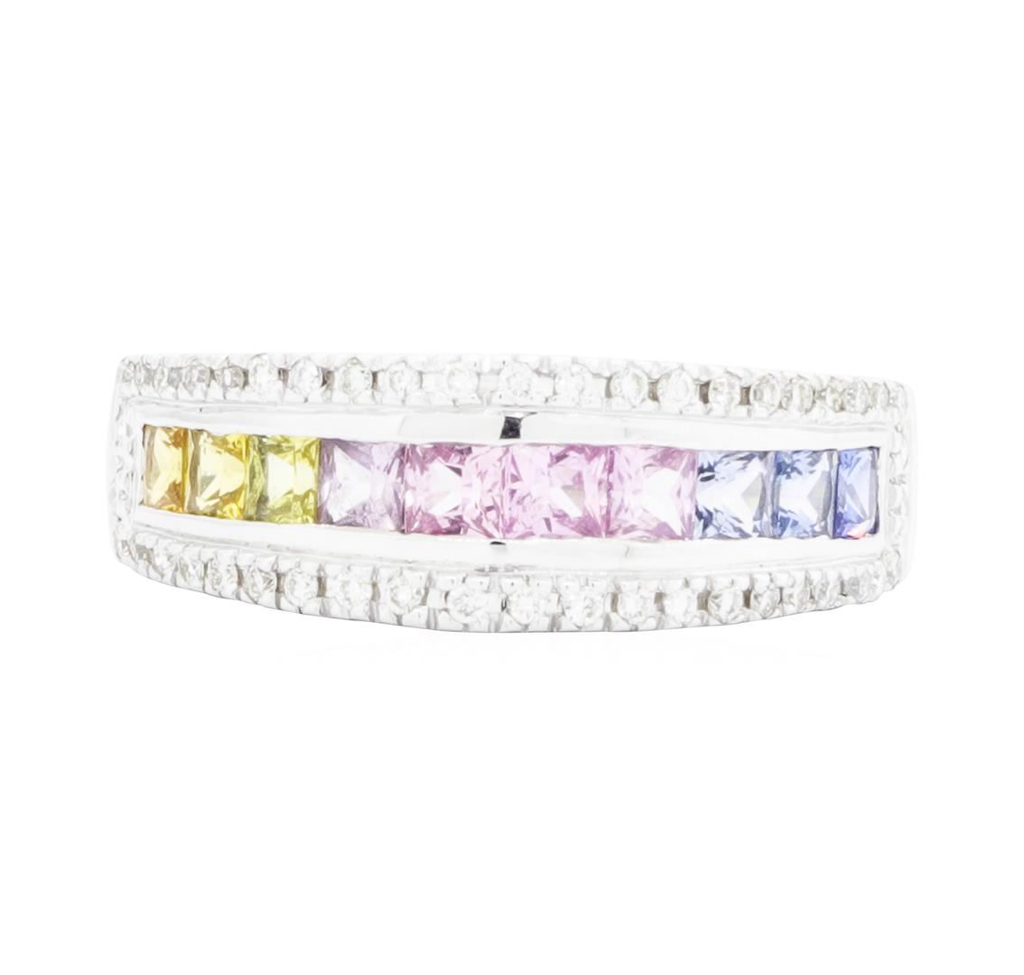 One electronically tested 14KT white gold lady's cast fashion ring with a tapered shank with a bright polish finish. The featured lady's ring has a shank measuring 3.30 millimeters wide. Identified with markings of '14K'. Condition is new, good workmanship. Containing: Ten channel set princess modified brilliant cut natural multi-color sapphires, measuring 2.80 x 2.60 x 1.69mm, (depth est.) approximate total weight of 1.20ct., clarity is eye clean, cut is very good. The featured sapphires range in color from orangy yellow to yellow to pink to blue. Colored gemstones are presumed to have been subjected to commonly used enhancement processes. Graded in the setting. Forty-Six prong set round brilliant cut diamonds, measuring 1.20 - 1.10 x 0.69mm (depth est.) approximate total weight of 46 Stones = 0.25ct. Graded in the setting. Color G - H Clarity VS-2 to SI-1 Cut Very Good. Total Weight of Colored Stones 1.20ct.. Total Weight of Diamonds 0.25ct.. Total Weight of Ring 5.40gm GAS Appraised.