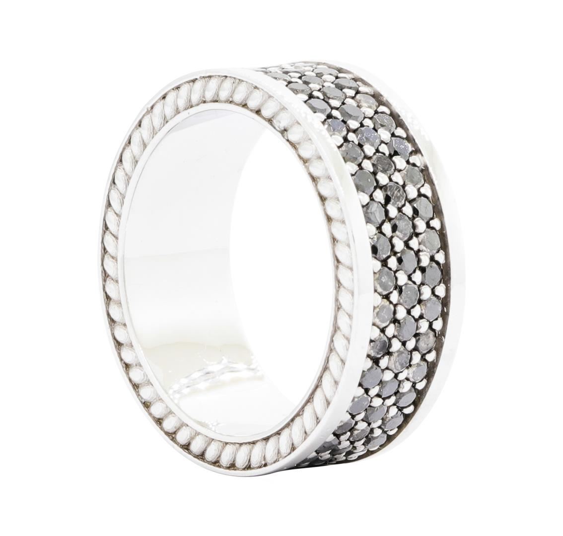 One electronically tested 14KT white gold lady's cast fashion band with a bright polish finish. The featured lady's ring has a twisted rope border and a shank measuring 7.75 millimeters wide. Condition is like new, good workmanship. Containing: One Hundred Eleven prong set round brilliant cut diamonds, measuring 1.70 - 1.60 x 1.02mm (depth est.) approximate total weight of 111 Stones = 2.00ct. Colored gemstones are presumed to have been subjected to commonly used enhancement processes. Graded in the setting. Color Fancy Black Cut Good. Total Weight of Diamonds 2.00ct.. Total Weight of Band 10.30gm GAS Appraised.