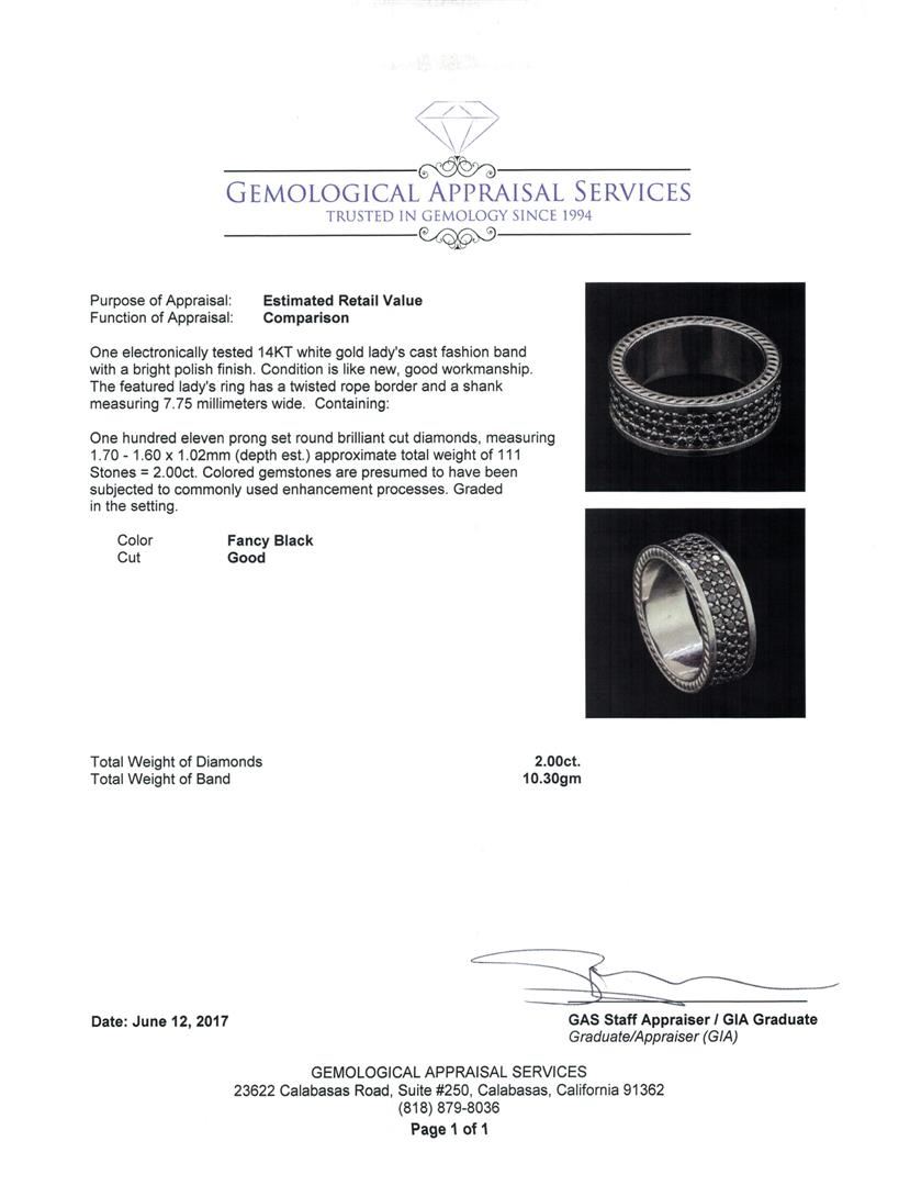One electronically tested 14KT white gold lady's cast fashion band with a bright polish finish. The featured lady's ring has a twisted rope border and a shank measuring 7.75 millimeters wide. Condition is like new, good workmanship. Containing: One Hundred Eleven prong set round brilliant cut diamonds, measuring 1.70 - 1.60 x 1.02mm (depth est.) approximate total weight of 111 Stones = 2.00ct. Colored gemstones are presumed to have been subjected to commonly used enhancement processes. Graded in the setting. Color Fancy Black Cut Good. Total Weight of Diamonds 2.00ct.. Total Weight of Band 10.30gm GAS Appraised.