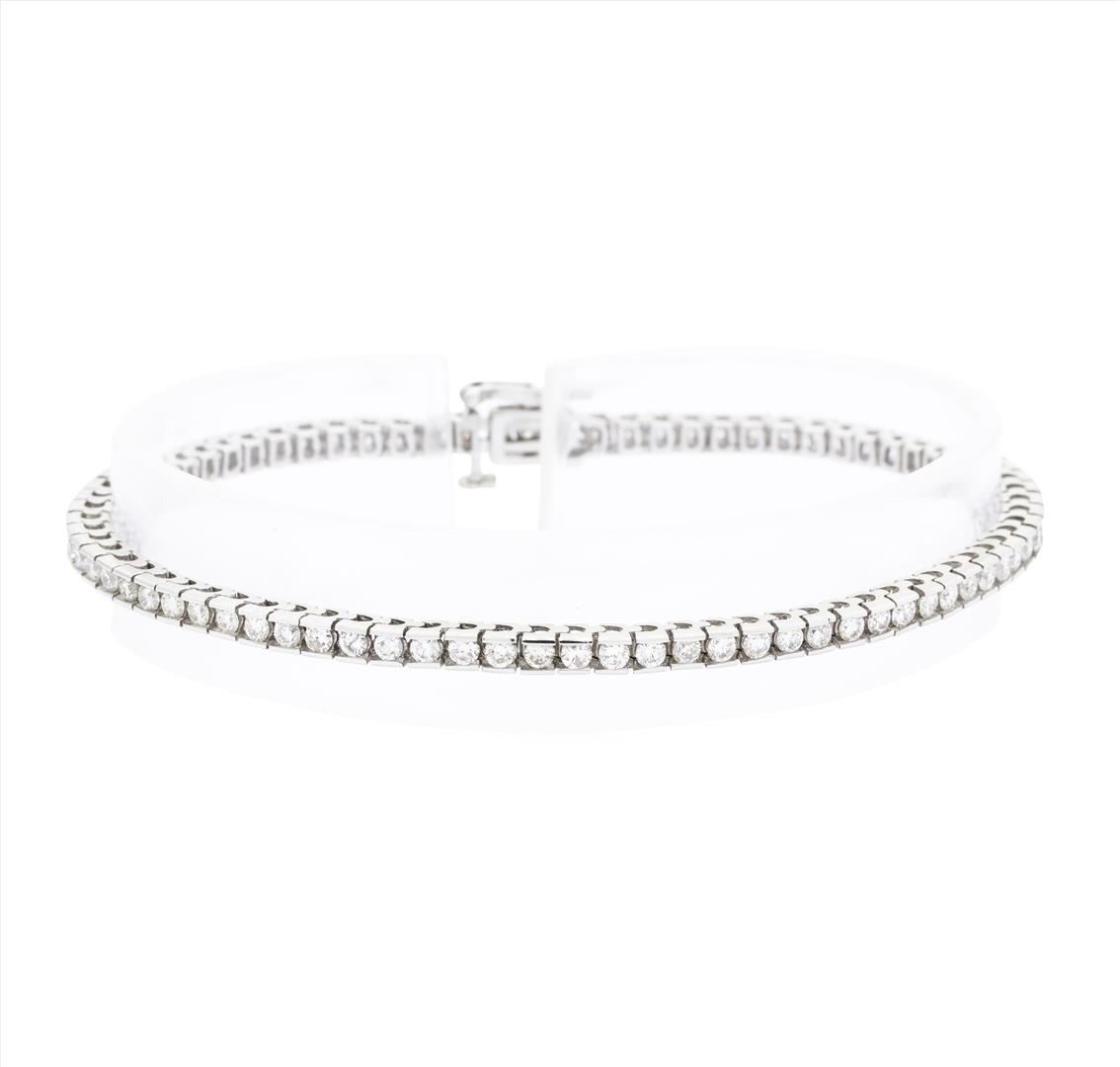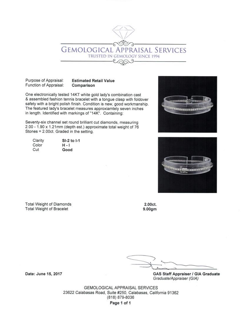One electronically tested 14KT white gold lady's combination cast & assembled fashion tennis bracelet with a tongue clasp with foldover safety with a bright polish finish. The featured lady's bracelet measures approximately seven inches in length. Identified with markings of '14K'. Condition is new, good workmanship. Containing: Seventy-Six channel set round brilliant cut diamonds, measuring 2.00 - 1.90 x 1.21mm (depth est.) approximate total weight of 76 Stones = 2.00ct. Graded in the setting. Color H - I Clarity SI-2 to I-1 Cut Good. Total Weight of Diamonds 2.00ct.. Total Weight of Bracelet 9.00gm GAS Appraised.