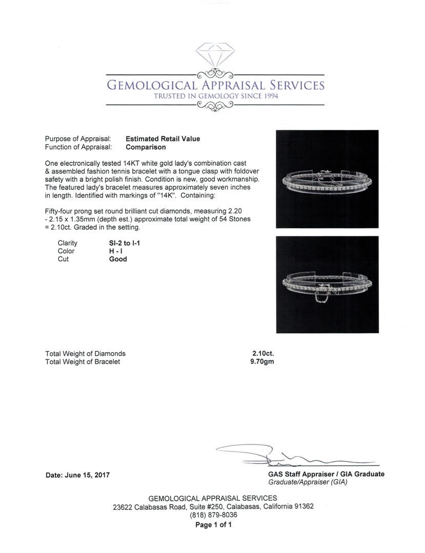One electronically tested 14KT white gold lady's combination cast & assembled fashion tennis bracelet with a tongue clasp with foldover safety with a bright polish finish. The featured lady's bracelet measures approximately seven inches in length. Identified with markings of '14K'. Condition is new, good workmanship. Containing: Fifty-Four prong set round brilliant cut diamonds, measuring 2.20 - 2.15 x 1.35mm (depth est.) approximate total weight of 54 Stones = 2.10ct. Graded in the setting. Color H - I Clarity SI-2 to I-1 Cut Good. Total Weight of Diamonds 2.10ct.. Total Weight of Bracelet 9.70gm GAS Appraised.