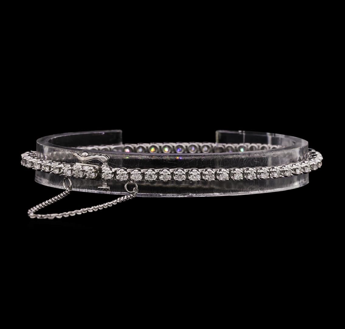 One electronically tested 14KT white gold lady's combination cast & assembled fashion tennis bracelet with a tongue clasp with foldover safety with a bright polish finish. The featured lady's bracelet measures approximately seven inches in length. Identified with markings of '14K'. Condition is new, good workmanship. Containing: Fifty-Four prong set round brilliant cut diamonds, measuring 2.20 - 2.15 x 1.35mm (depth est.) approximate total weight of 54 Stones = 2.10ct. Graded in the setting. Color H - I Clarity SI-2 to I-1 Cut Good. Total Weight of Diamonds 2.10ct.. Total Weight of Bracelet 9.70gm GAS Appraised.
