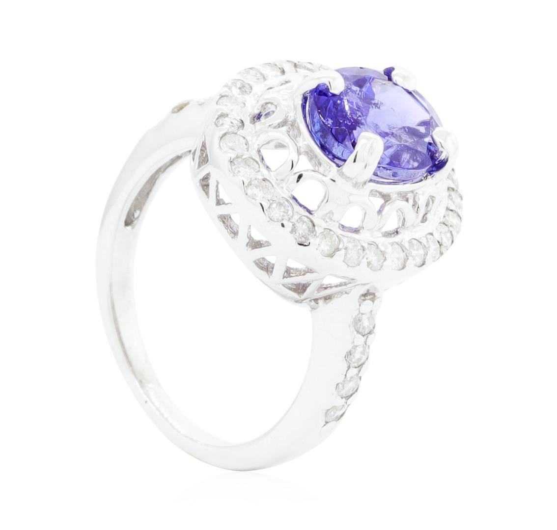One electronically tested 14KT white gold lady's cast fashion ring with a basket halo with a bright polish finish. The featured lady's ring has a shank measuring 1.96 millimeters wide. Identified with markings of '14K'. Condition is new, good workmanship. Containing: One prong set oval modified mixed cut natural tanzanite, measuring 9.03 x 6.95 x 5.70mm, (depth est.) approximate weight of 2.46ct., clarity is severely included, medium, moderately strong, violetish blue color, (GIA vB 5/4), cut is good. Transmitting light somewhat diffusely, transparent to translucent. Colored gemstones are presumed to have been subjected to commonly used enhancement processes. Graded in the setting. Thirty-Six prong set round brilliant cut diamonds, measuring 1.80 - 1.60 x 1.02mm (depth est.) approximate total weight of 36 Stones = 0.60ct. Graded in the setting. Color G - I Clarity I-1 to I-2 Cut Good. Total Weight of Colored Stones 2.46ct.. Total Weight of Diamonds 0.60ct.. Total Weight of Ring 4.90gm GAS Appraised.