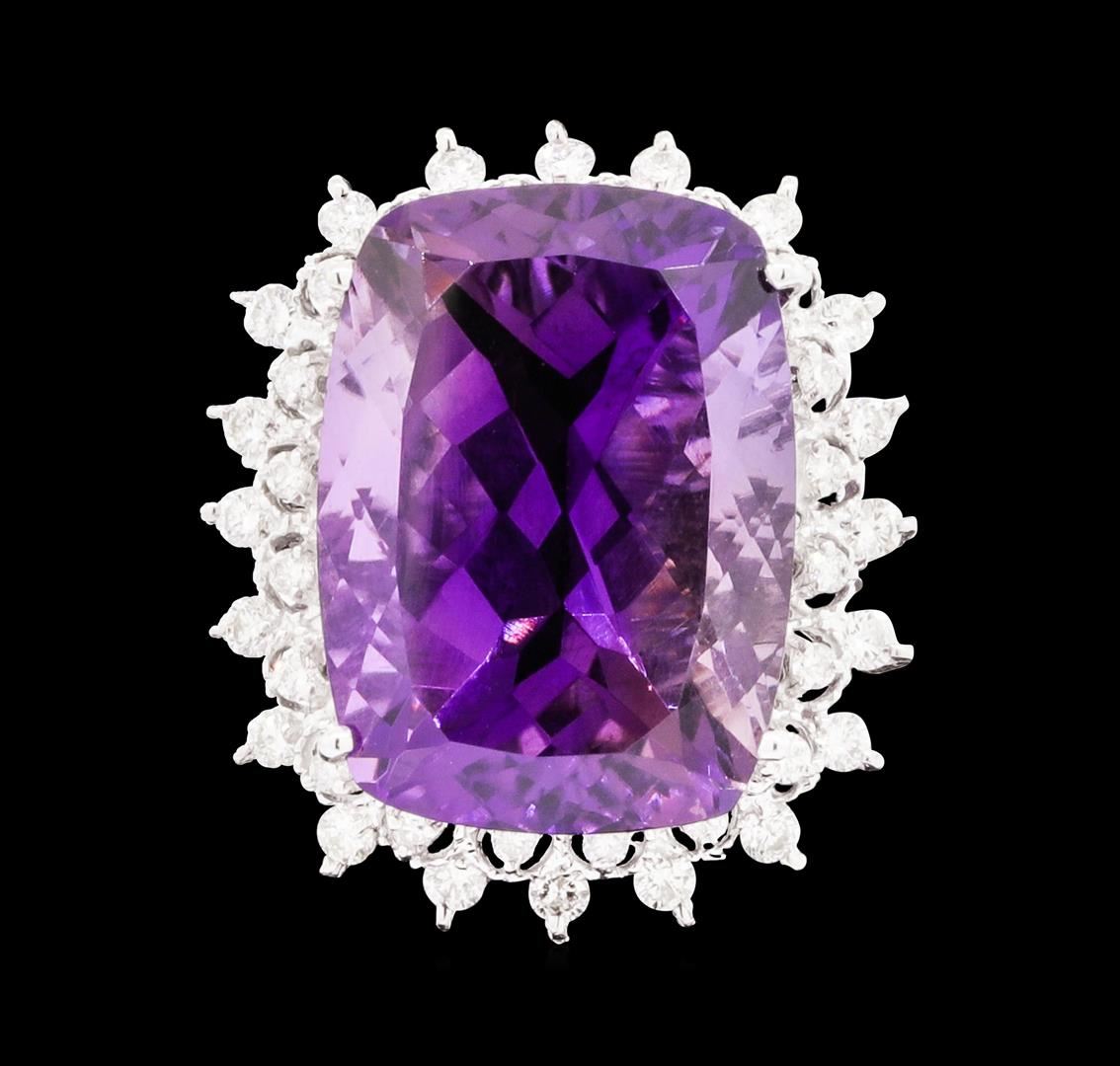 One electronically tested 14KT white gold lady's cast fashion ring with a staggered double basket halo with a bright polish finish. The featured lady's ring has a shank measuring 2.50 millimeters wide. Identified with markings of 'K14'. Condition is new, good workmanship. Containing: One prong set rectangular cushion modified brilliant cut natural amethyst, measuring 21.90 x 16.10 x 12.01mm, (depth est.) approximate weight of 25.72ct., clarity is eye clean, medium dark, moderately strong, reddish purple color, (GIA rP 6/4), cut is good. Transmitting light with no distortion, transparent. Colored gemstones are presumed to have been subjected to commonly used enhancement processes. Graded in the setting. Twenty prong set round brilliant cut diamonds, measuring 2.25 - 2.20 x 1.38mm (depth est.) approximate total weight of 20 Stones = 0.85ct. Graded in the setting. Color H - I Clarity SI-2 to I-1 Cut Good Twenty prong set round brilliant cut diamonds, measuring 1.70 - 1.60 x 1.02mm (depth est.) approximate total weight of 20 Stones = 0.34ct. Graded in the setting. Color H - I Clarity SI-1 to I-1 Cut Good. Total Weight of Colored Stones 25.72ct.. Total Weight of Diamonds 1.19ct.. Total Weight of Ring 11.80gm GAS Appraised.